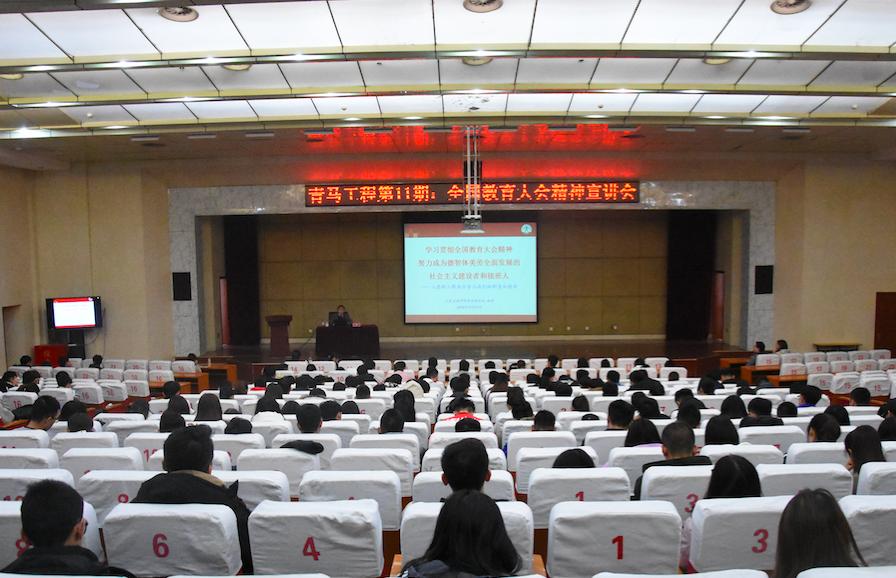 唐勇围绕全国教育大会的时代背景、重要意义和主要精神三个方面,结合9个坚持、6个下功夫深入解析了全国教育大会精神和习近平总书记重要讲话精神,并结合我校办学实际,从德、智、体、美、劳五方面阐述了我校人才培养的目标和特色,要求广大团员青年坚持回归常识勤学习、回归本分重教育、回归初心树新人、回归梦想展红旗,努力成长为德智体美劳全面发展的社会主义建设者和接班人。