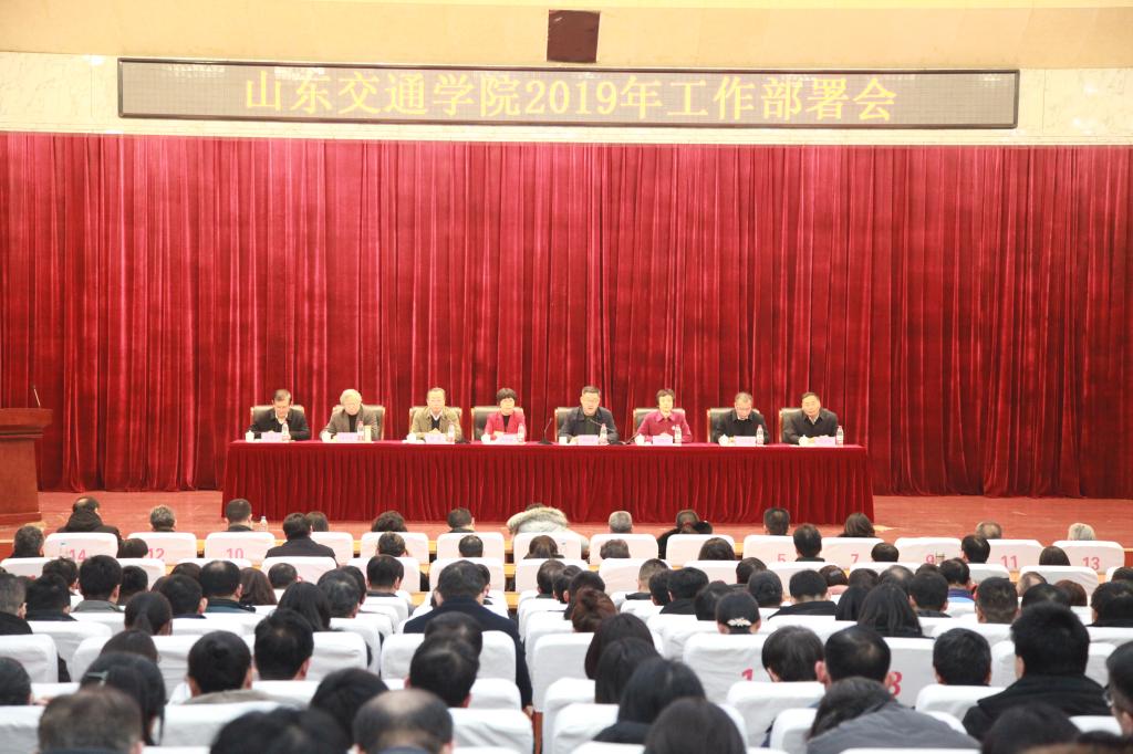 党委副书记、院长陈松岩详细解读了学校2019年的工作要点,指出2019年学校工作的总体思路是:以习近平新时代中国特色社会主义思想为指导,深入贯彻党的十九大和十九届二中、三中全会精神,全面落实全国、全省教育大会精神和新时代全国高等学校本科教育工作会议精神,主动融入国家战略,服务地方经济发展和行业发展,坚持稳中求进工作总基调,坚持高质量发展,以开展“工作落实年”为总抓手,以达到申硕基本条件为关键目标,全面加强党的建设,全面提升办学质量,推动依法治校和科学发展,发扬“交院人精神”和“咬定青山不放松”的韧劲,决战2019,决胜2019,举全校之力打赢“1245”攻坚战,以优异成绩迎接中华人民共和国成立70周年。他代表学校党委和行政从“提高站位抓落实,全面加强党的建设”“突出重点抓落实,全面提升学校核心竞争力”“强力推进抓落实,全面推动学校科学发展”“务求实效抓落实,全面优化校区办学资源”“强化责任抓落实,全面提升细致高效服务”等五个方面部署了学校2019年的工作。