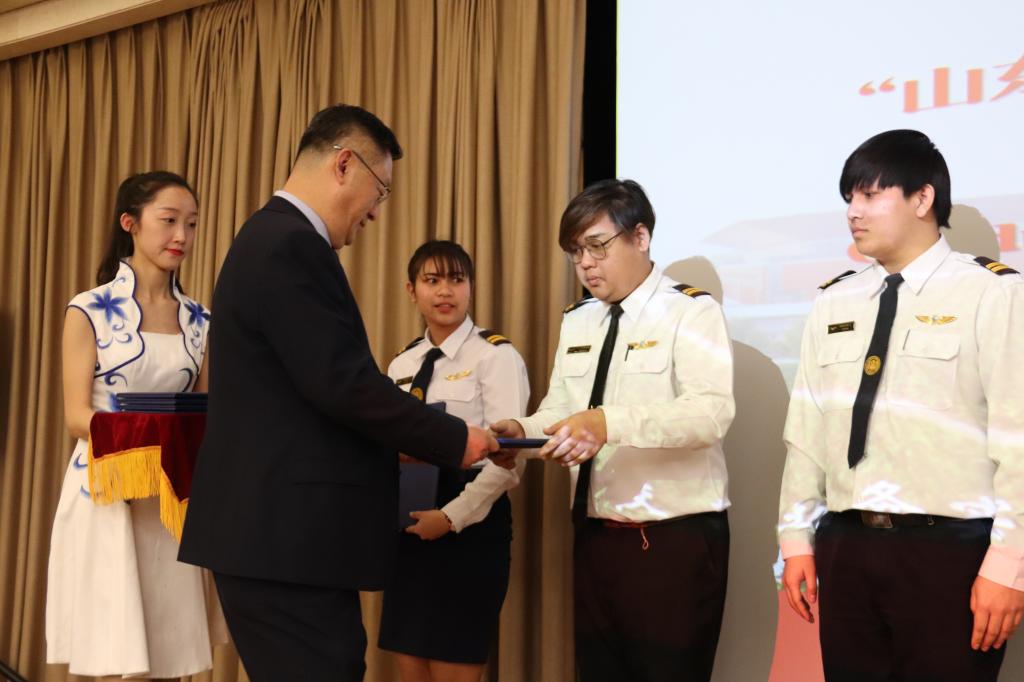 会谈结束后,双方共同为结业学生颁发结业证书,为新入校学生授衔并颁发录取通知书。阿杜·平松为我校3名航空学院教师颁发孔敬工业社区教育学院聘任证书。
