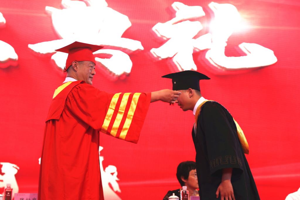 院长陈松岩为2019届优秀毕业生代表正冠拨穗,颁发了毕业证和学位证书,并在毕业证纪念板上签字留念。