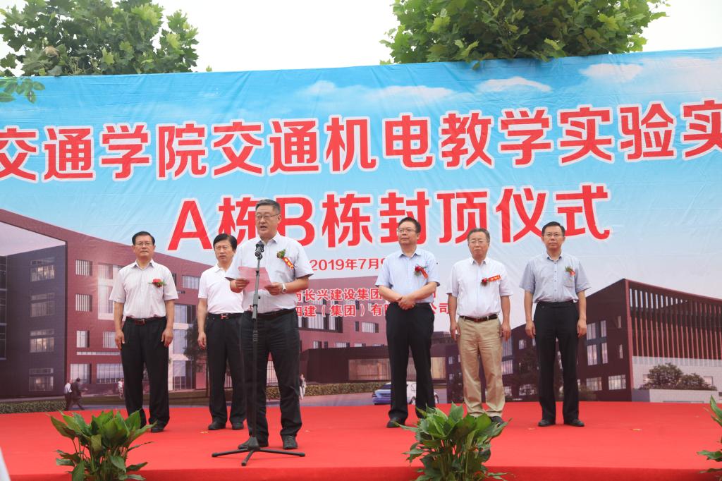 7月9日上午,我校举行交通机电教学实验实训楼工程主体结构封顶仪式。院长陈松岩,党委副书记唐勇,副院长孔祥云、姜华平,济南四建集团党委副书记、总经理李力,济南长兴集团党委副书记、总经理董春普参加庆典仪式。