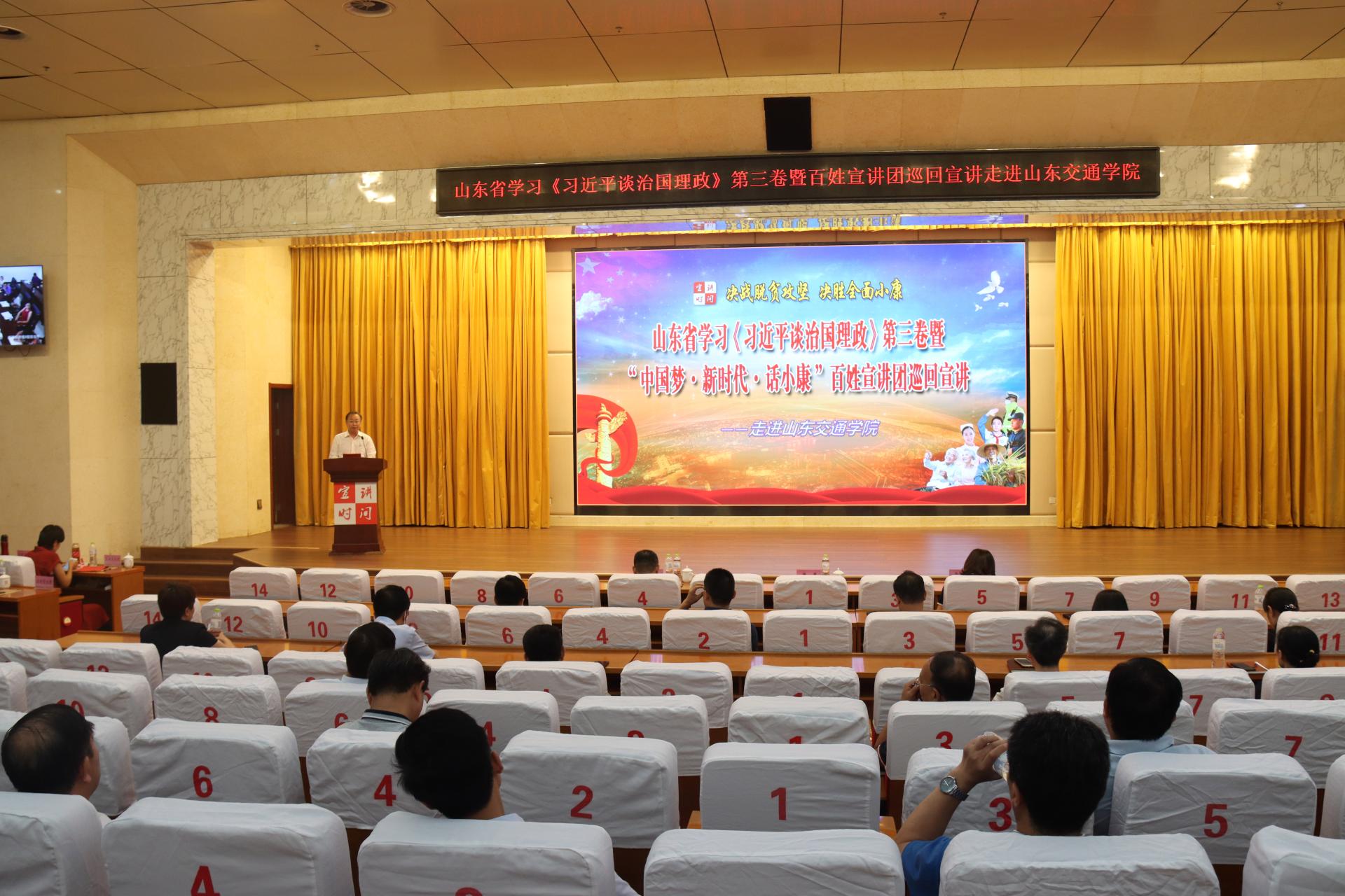 9月14日下午,山东省委宣传部、省委讲师团组织的全省学习《习近平谈治国理政》第三卷暨“中国梦·新时代·话小康”百姓宣讲在我校长清校区学术报告厅举行。省委讲师团副团长王为华、省委教育工委宣教处副处长(挂职)于恬出席宣讲会。宣讲会由学校党委副书记唐勇主持。