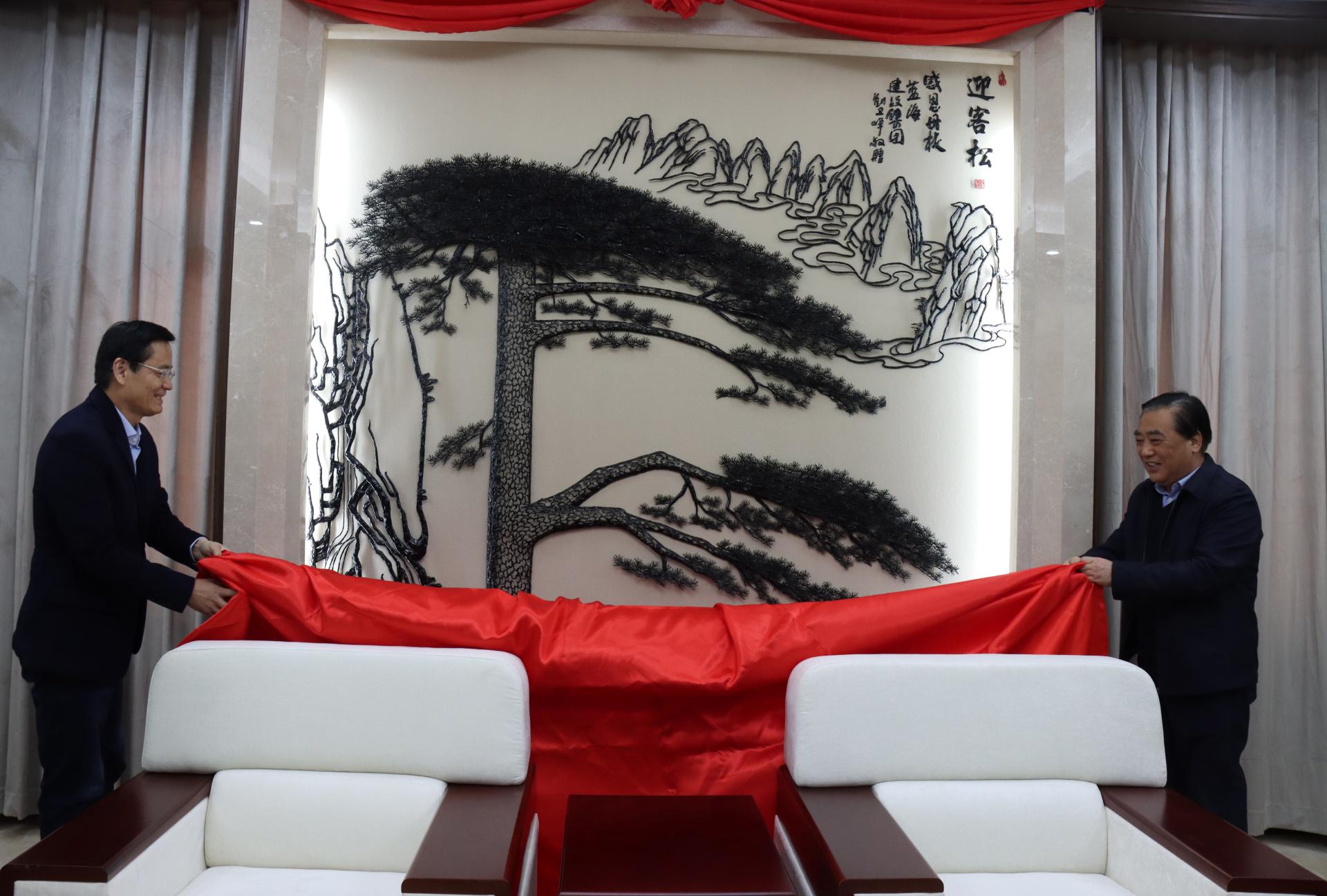陈松岩主持铁画《迎客松》揭幕仪式。他指出,一直以来,刘卫峰心系母校,在学校设立“蓝海建设慈善基金会奖学金”,助力教育事业发展。在学校明德楼贵宾接待室正式启用之际,蓝海建设集团捐赠大型铁画《迎客松》,希望学校和蓝海建设集团能像黄山迎客松一样永葆奋进之心、勇立时代潮头,为国家、社会发展作出新的更大贡献!