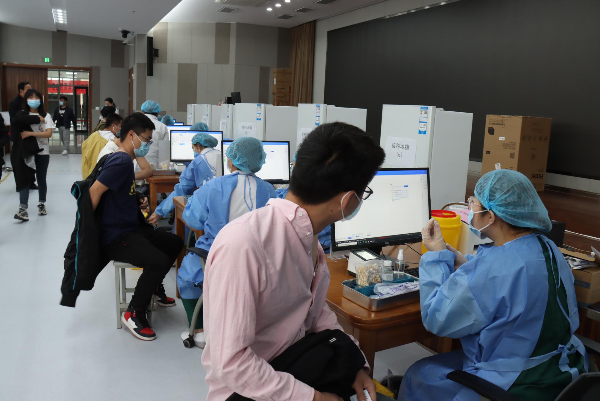 在疫苗接种现场,校医院医护人员现场服务,负责发放知情同意书、收取健康信息承诺书,为大家核对健康和身份信息、进行疫苗注射、开展留观医疗咨询。相关单位(部门)共同组织符合接种条件的学生排队接种,并维持场内外秩序,全力保障新冠疫苗接种工作的顺利进行。