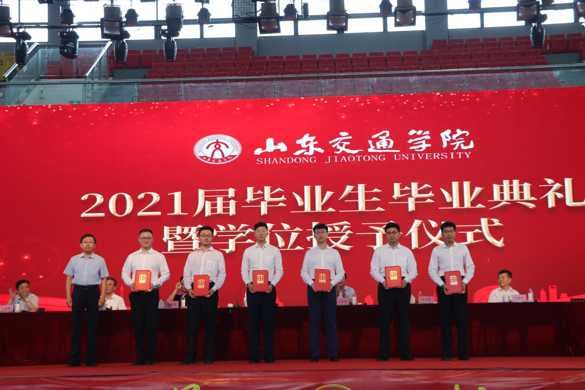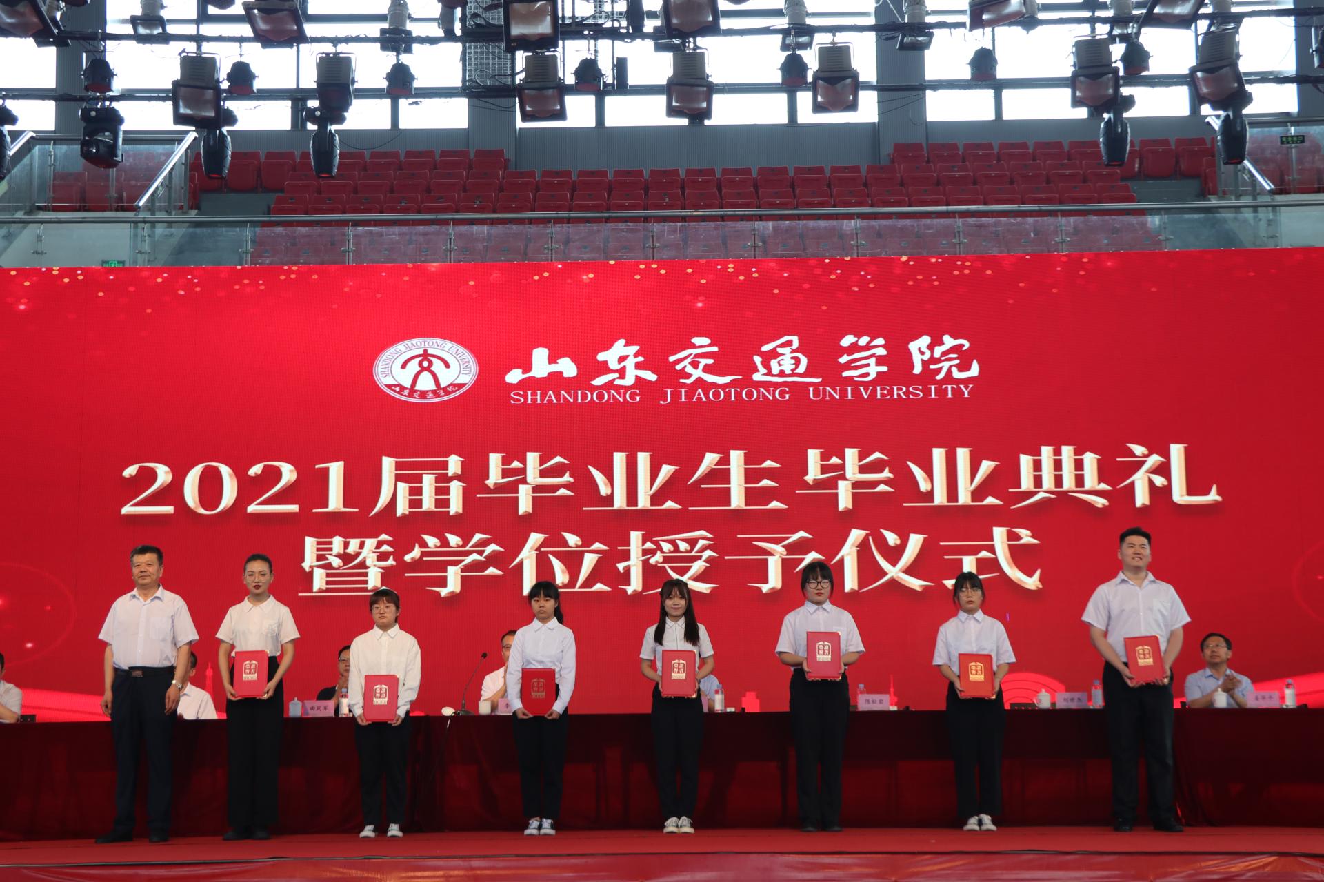 与会学校领导宣读《关于表彰2021届优秀毕业生、自主创业毕业生、西部计划志愿者的通报》,并为获得荣誉的毕业生颁发证书。陈宏霜等761人获得2021届“山东交通学院优秀毕业生”荣誉称号;王玲等383人获得2021届“山东省优秀毕业生”荣誉称号;战文鑫等22人成功创业;4名毕业生参加西部计划志愿者。