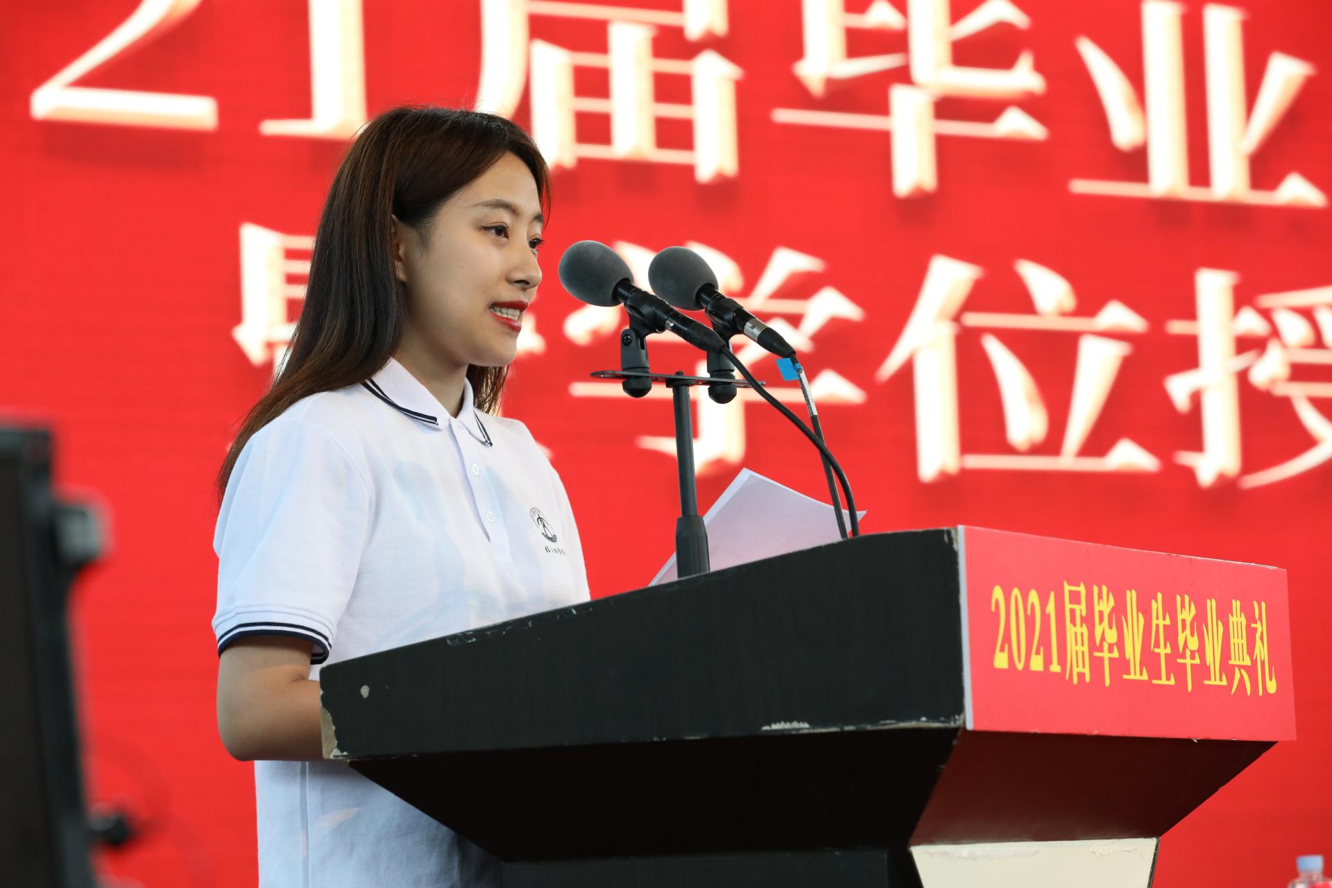 2021届本科毕业生代表、经济与管理学院财务171班蔡卓君发言。她重温漫漫来时路,回忆脉脉校园情,深情感谢父母的养育、师长的教导、同学的陪伴以及母校的培养,并表示未来踏上工作岗位将秉承校训,不忘初心,砥砺前行,用实际行动让山东交通学院的名字更加响亮!
