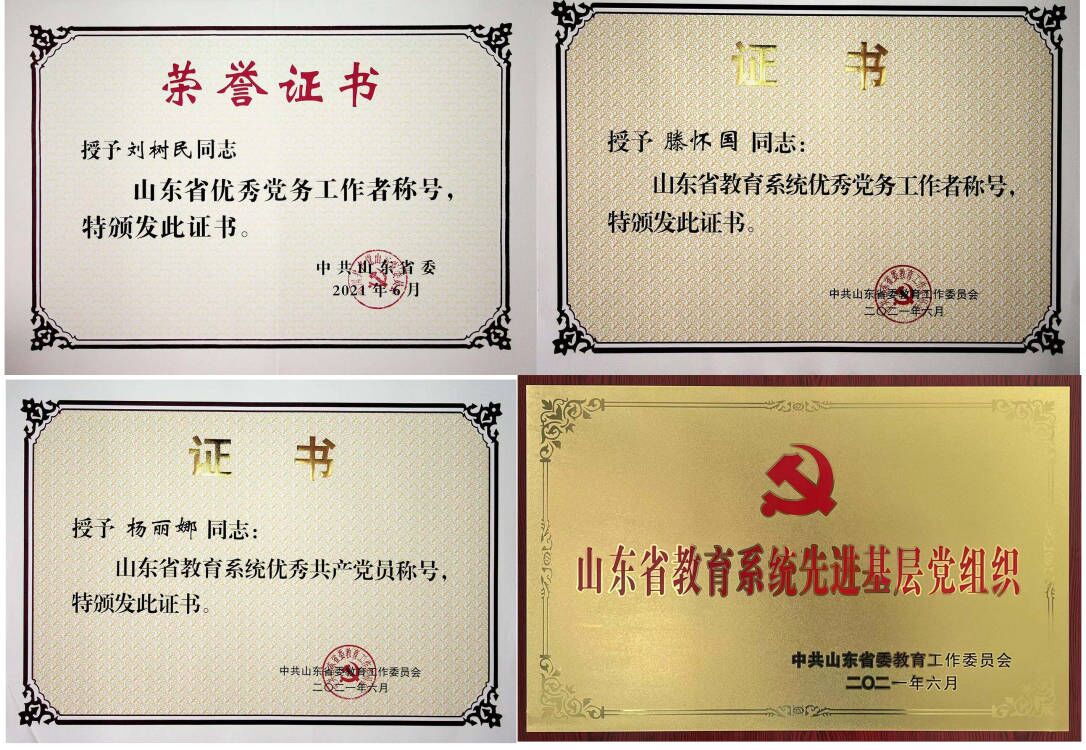 为进一步激励各级党组织和党员同志干事创业的积极性,在庆祝中国共产党成立100周年之际,山东省委和省委教育工委对优秀共产党员、优秀党务工作者和先进基层党组织进行表彰,我校获得全省和全省教育系统“两优一先”多项荣誉。