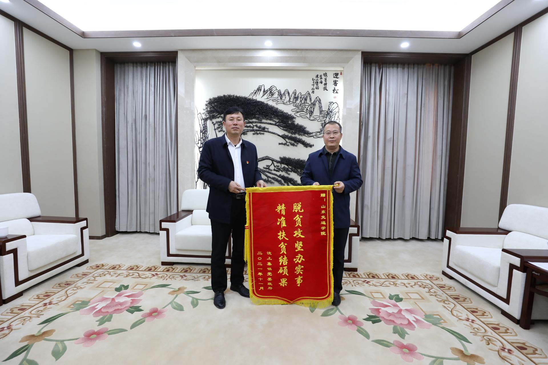 李贞涛代表学校向汶上集镇捐赠了一批教学办公设备,赵中国代表汶上集镇党委政府向学校赠送了锦旗。