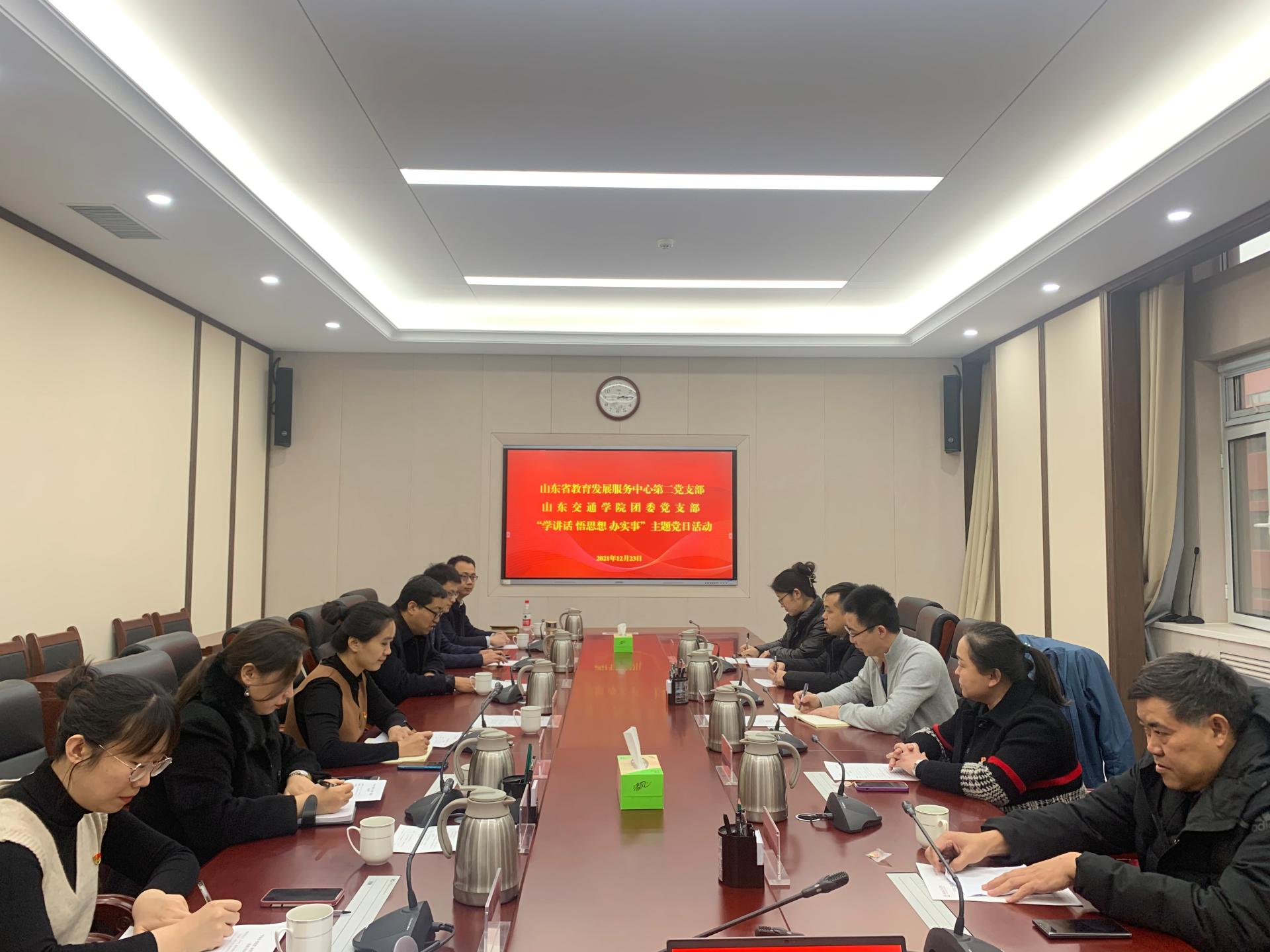 12月23日下午,我校团委党支部与山东省教育发展服务中心第二党支部联合开展主题党日活动,并举行结对共建座谈会。山东省教育发展服务中心副主任林相春作为普通党员参加活动。学校党委副书记李贞涛会见来宾。座谈会由团委党支部书记吴硕主持。