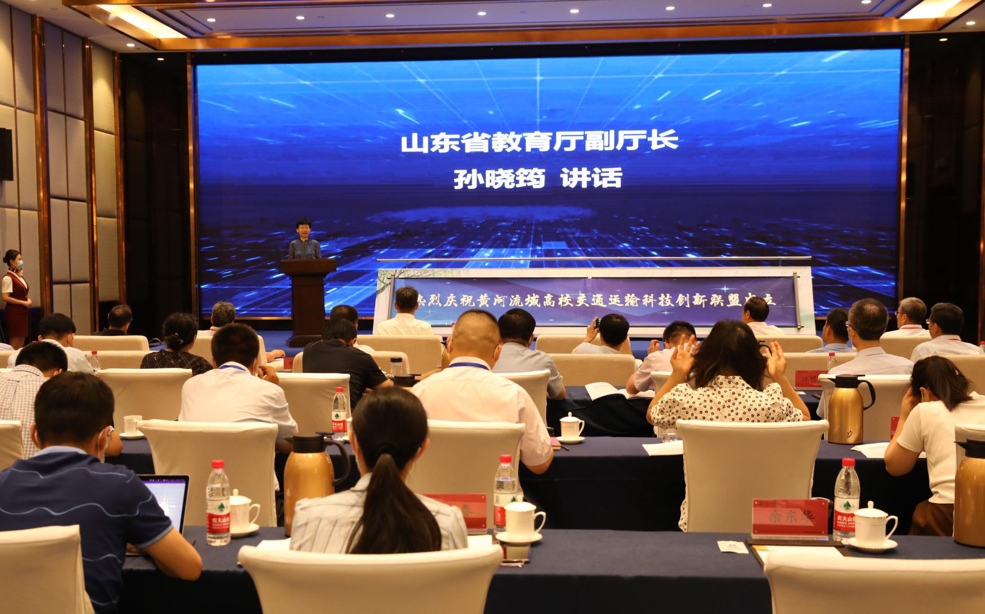 省教育厅副厅长孙晓筠,省科学技术厅党组成员、副厅长潘军,省交通运输厅党组成员、副厅长司家军出席会议并致辞;长安大学党委副书记、校长沙爱民,兰州交通大学副校长陈兴冲,内蒙古大学党委委员、交通学院党委书记孙智凭,太原科技大学交通与物流学院院长晋民杰;山东省海洋科学研究院党组成员、副院长黄祖亮;山东交通学院党委书记王焕斌,党委副书记、院长陈松岩,党委委员、副院长来逢波,党委委员、党委办公室(学校办公室)主任、党委统战部部长王晨晖;以及济南市教育局、科技局,长清区政府、交通运输局,济南新旧动能转换起步区相关领导出席成立大会。会议由王焕斌主持。