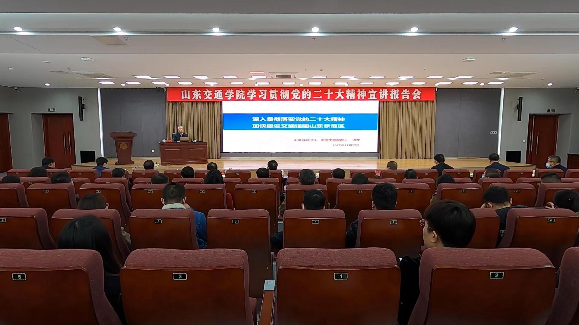 凌文以“深入贯彻落实党的二十大精神 加快建设交通强国山东示范区”为题,从深刻领会准确把握党的二十大的主题和主要成果、过去5年工作和新时代10年伟大变革、马克思主义中国化时代化新境界、以中国式现代化推进中华民族伟大复兴、全面建设社会主义现代化国家的目标任务、加强党的全面领导和全面从严治党等6个方面,阐述了党的二十大精神的丰富内涵。