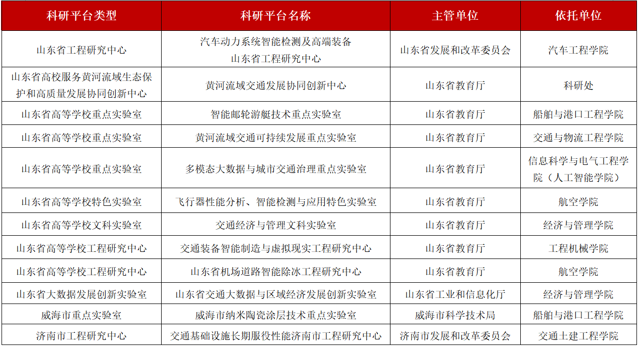 新增科研平台包括:1个山东省工程研究中心、1个山东省高校服务黄河流域生态保护和高质量发展协同创新中心、5个山东省高等学校重点实验室、2个山东省高等学校工程研究中心、1个山东省大数据发展创新实验室、1个威海市重点实验室和1个济南市工程研究中心。新增科研平台主动服务国家战略,凝聚特色学科优势,打破学科专业壁垒,科学合理组建团队,聚焦于黄河流域交通运输、智能装备、智能邮轮、智能航空、交通经济、交通大数据、交通基础设施等多个前沿领域,与知名企事业单位加深合作,强强联合开展科技攻关,为学校科技创新支撑体系增加了强劲力量。