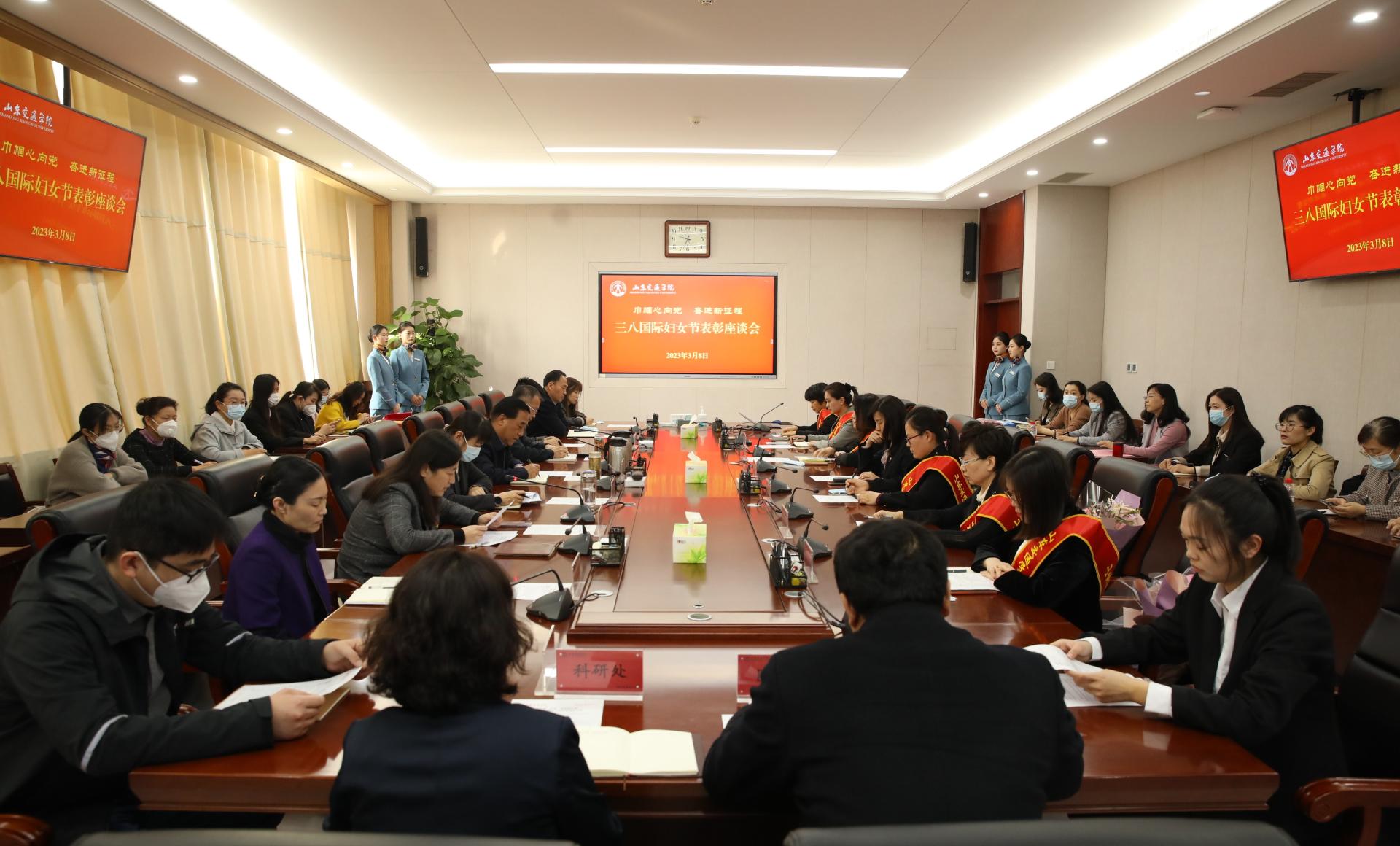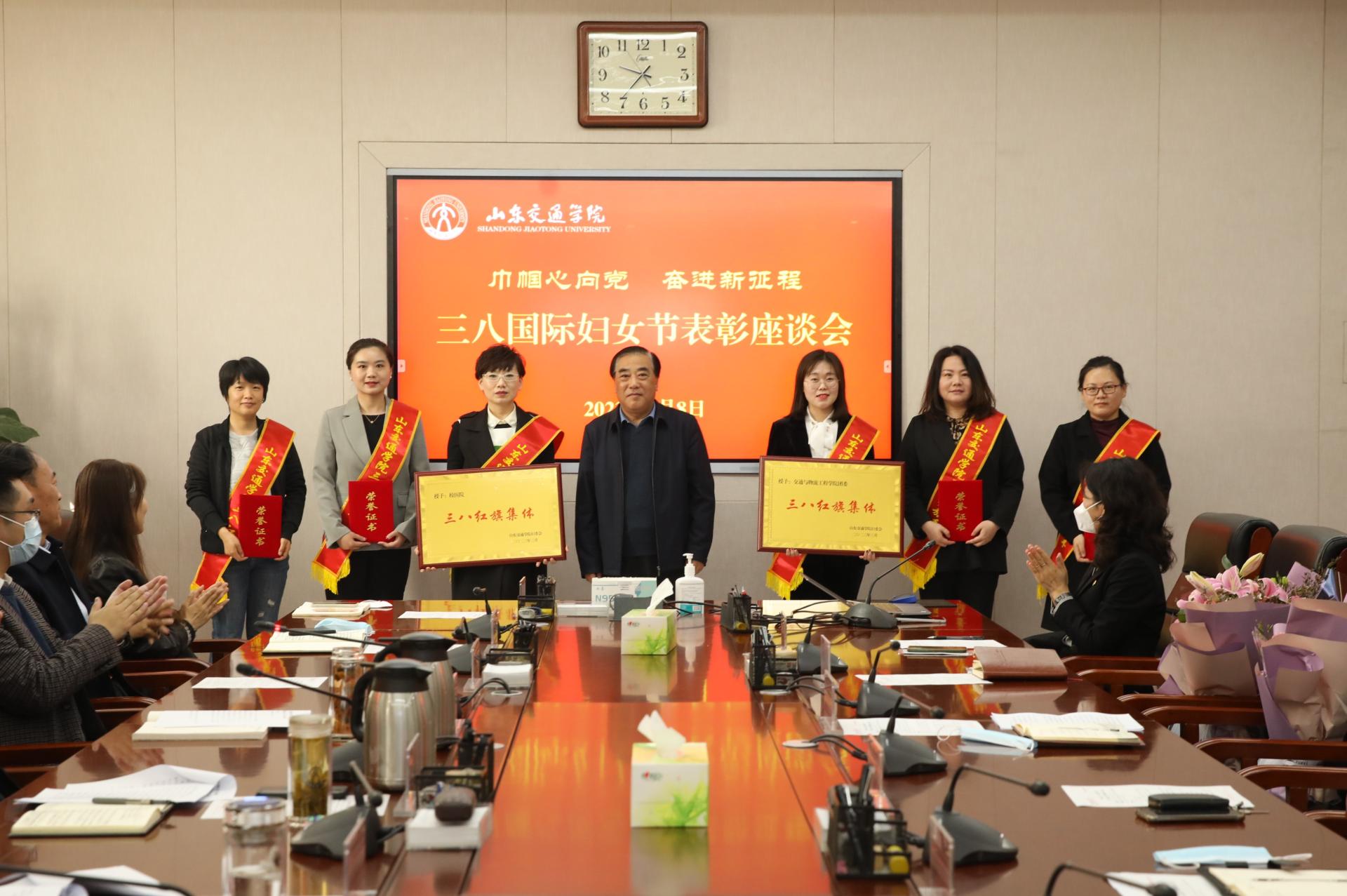 3月8日上午,学校在长清校区明德楼303会议室召开以“巾帼心向党 奋进新征程”为主题的“三八”国际妇女节表彰座谈会。党委书记王焕斌,党委副书记李贞涛,党委委员、党委宣传部部长周颜玲出席会议。会议由李贞涛主持。