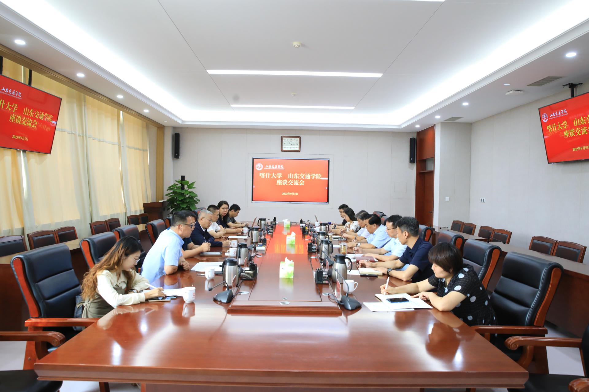 王焕斌向丁邦文一行的到访表示热烈欢迎,介绍了学校建设历程与发展近况。他指出,近年来学校主动适应经济社会发展新形势,坚持应用型和行业性两大特色,在人才培养、科学研究、社会服务等方面取得了显著成绩。山东交通学院和喀什大学虽然远隔千里,但联系紧密,感情深厚,自2016年两校签署框架协议,开启了双方合作共赢、共谋发展的序幕以来,在双方共同努力下,喀什大学交通学院从无到有,物流工程、交通工程等3个本科专业成功申报并开始招生,两校合作共建结出了丰硕成果。他表示,学校将进一步做深做实对口支援工作,全力助推喀什大学交通学院和交通学科建设。