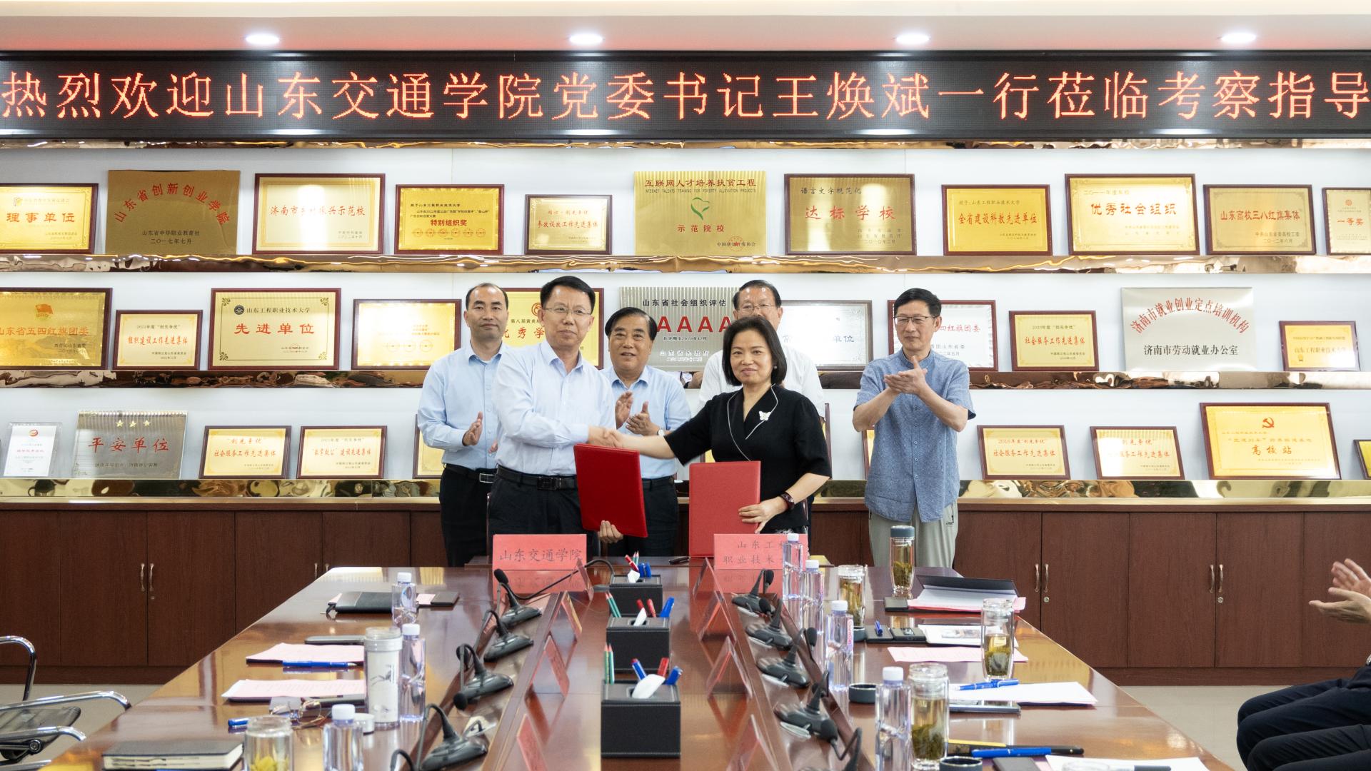 王焕斌介绍了学校近年来的发展情况及改革成果,充分肯定了两校合作以来取得的成绩。他表示,此次签署人才培养合作平台和党建工作院系结对共建协议,标志着两校合作进入新阶段、迈上新台阶。山东交通学院将在既有合作基础上,继续发挥自身优势,在党组织建设、人才培养、科技研发、资源共享等方面与山东工程职业技术大学展开深入合作,积极拓展合作领域,共同谱写教育事业高质量发展新篇章。