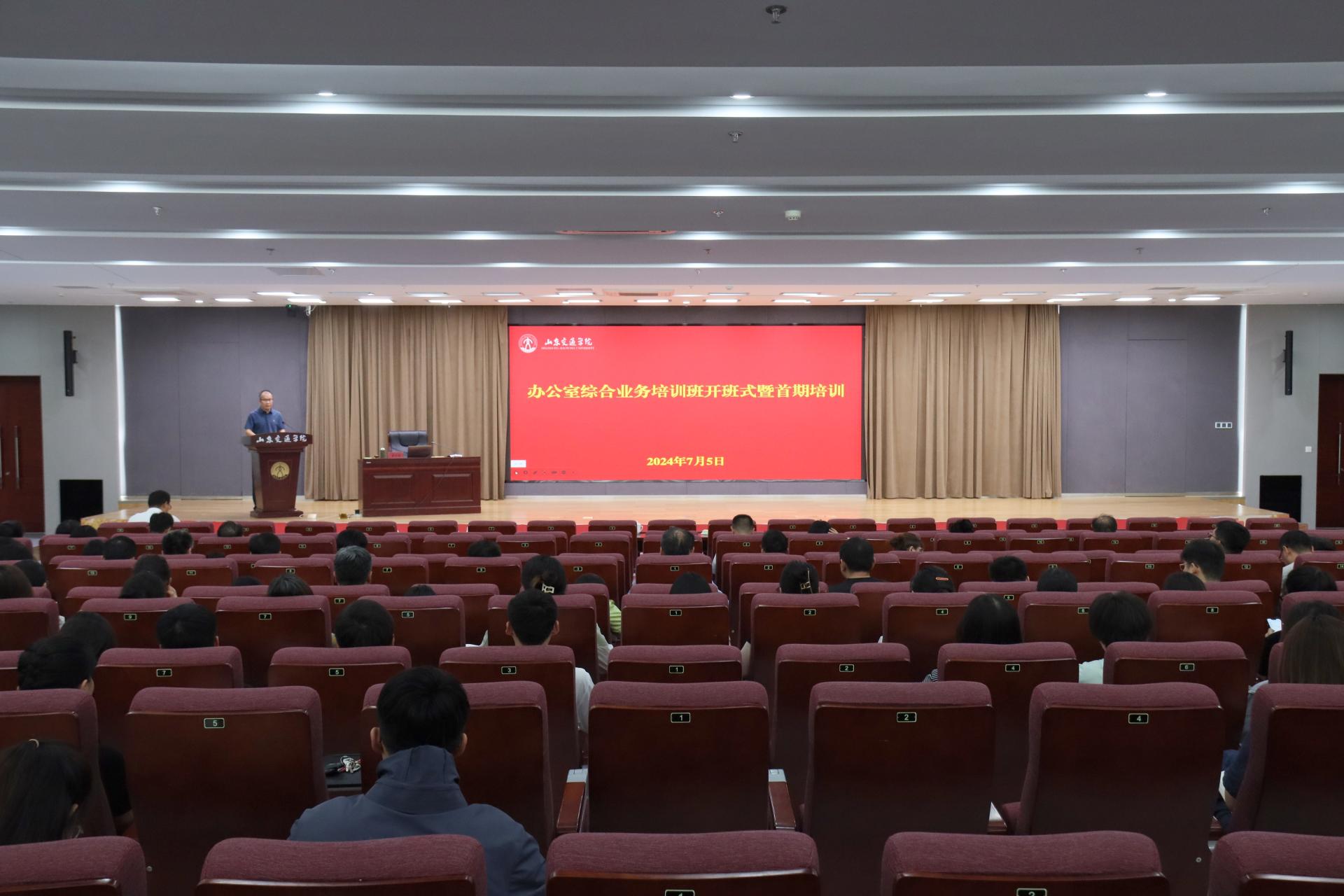 7月5日,学校在长清校区明德楼101报告厅举办办公室综合业务培训班开班式暨首期培训,邀请省委教育工作领导小组办公室秘书处副处长翟文璐作专题辅导报告。学校党委副书记李贞涛出席开班式并讲话。