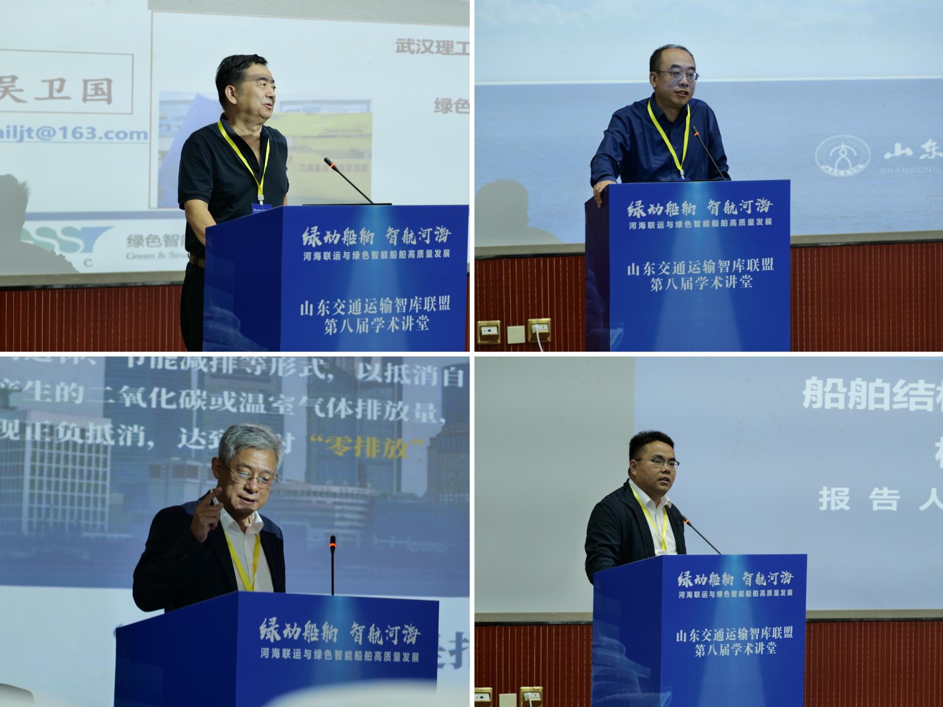 讲堂特邀武汉理工大学吴卫国教授、哈尔滨工业大学(威海)桂洪斌教授、哈尔滨工程大学李海超研究员、山东将海海洋科技有限公司姜永董事长等四位专家作主旨报告。他们围绕智能船舶技术趋势、船舶电动化与智能化、全生命周期绿色船舶技术、船舶结构振动噪声与机器学习融合、新能源的河海联运船舶应用实践等前沿议题展开深入解读,引发与会代表的广泛共鸣。