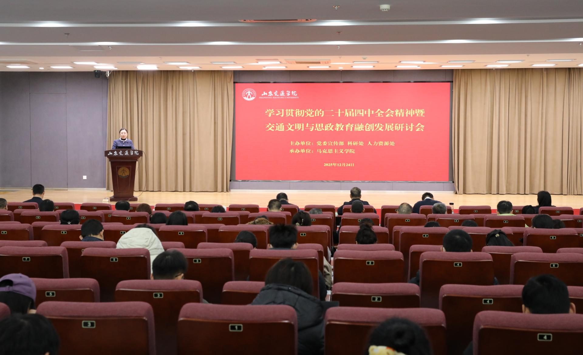 12月24日上午,学校在长清校区明德楼101报告厅举行学习贯彻党的二十届四中全会精神暨交通文明与思政教育融创发展研讨会。学校党委副书记李贞涛,党委委员、副院长张萌萌出席会议。