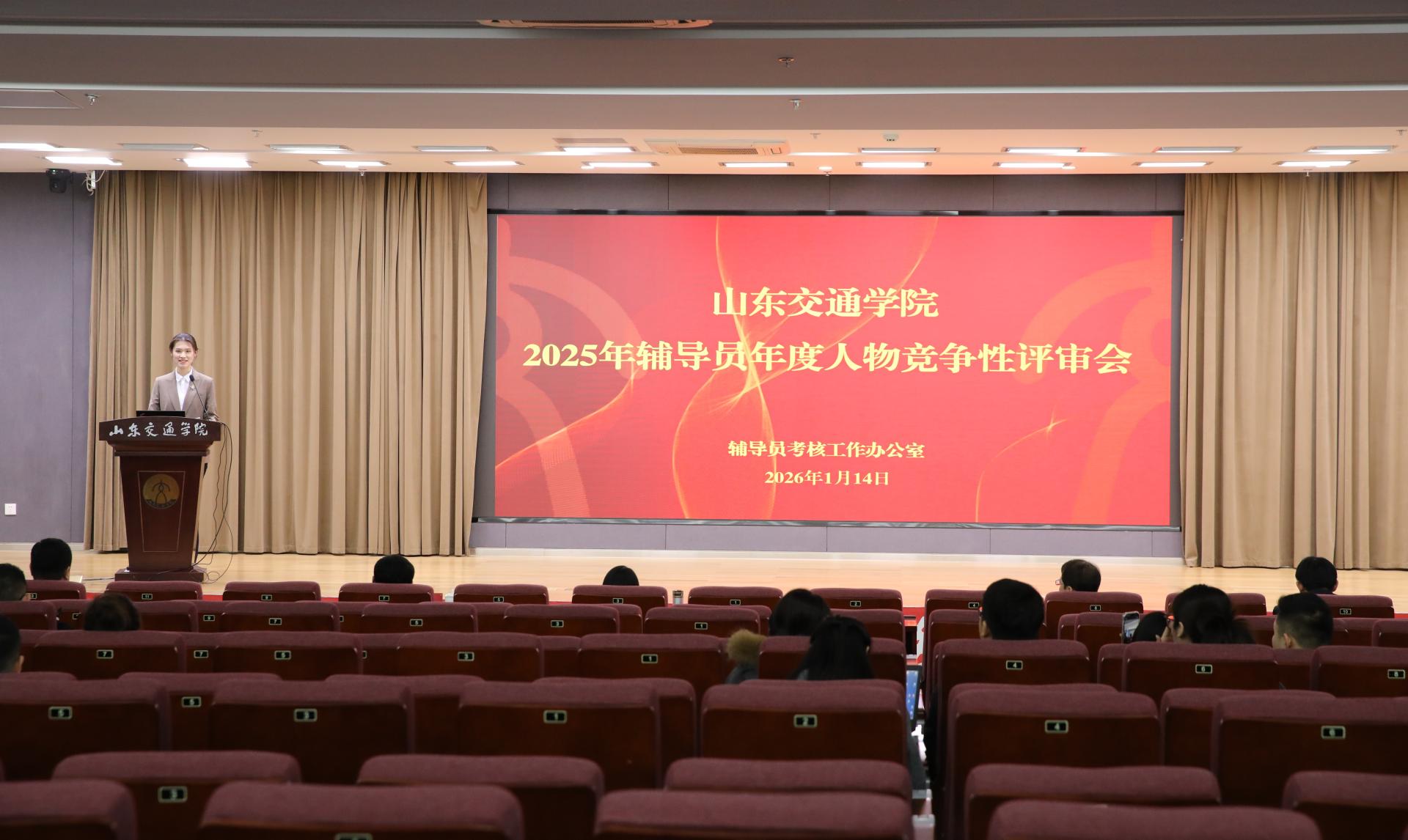 1月14日下午,学校在长清校区明德楼101报告厅举行2025年辅导员年度人物评选会。学校党委副书记李贞涛,党委委员、党委组织部部长王兴盈出席。会议邀请山东师范大学、山东女子学院、山东艺术学院学生工作相关负责人担任评委。