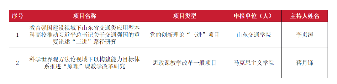 近日,山东省教育厅公布2025年山东省思想政治教育教学改革项目立项名单,我校2项课题获批立项。其中,获批党的创新理论“三进”项目1项、思政课教学改革项目1项。