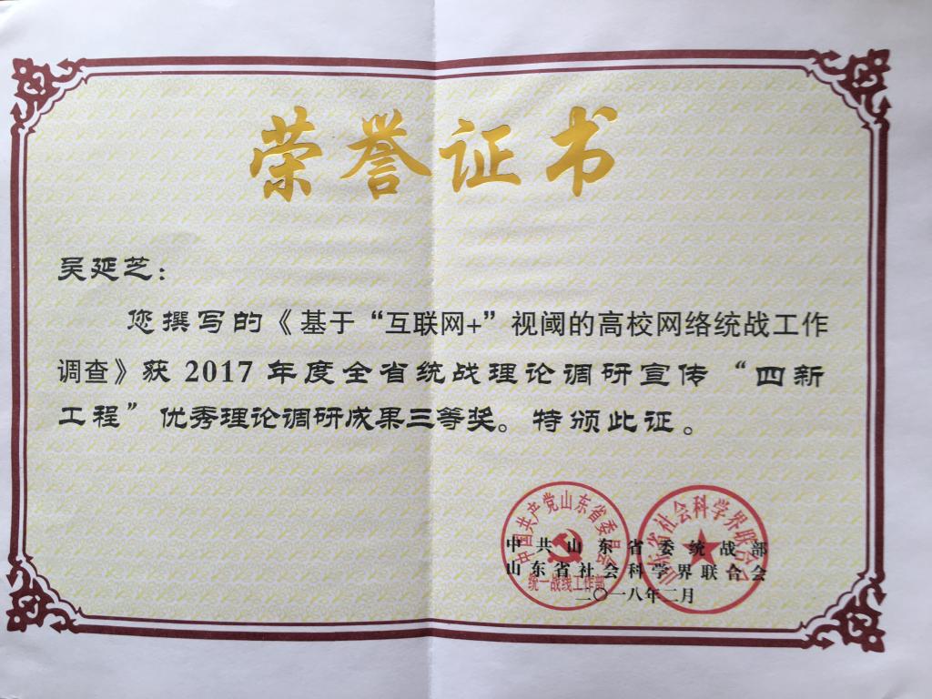 近日,经中国共产党山东省委统战部以及山东省社会科学界联合会审批,通报表彰全省2017年度统战理论调研宣传“四新工程”优秀成果,九三学社我校支社社员吴延芝老师撰写的《基于互联网+视阈的高校网络统战工作调查》获2017年度全省统战理论工作调研宣传“四新工程”优秀理论调研成果三等奖。
