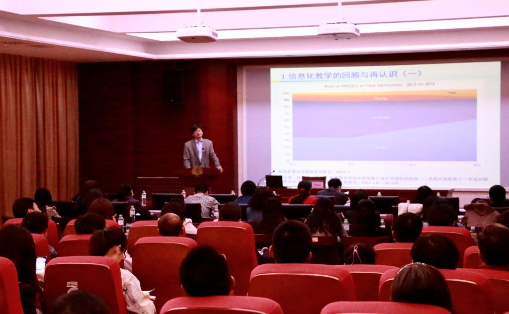 本次专题培训的主题是“混合教学系统化研究与实践”,邀请到清华大学教育研究院副院长、博士生导师韩锡斌博士。培训会上,韩锡斌系统地介绍了国外高校混合教学的最新动态、高校混合教学探索的总体思路、混合教学的理论体系、技术系统和实施方案。通过分析国内外信息化教学发展的历程,韩锡斌指出,高等教育借助在线发展已成为不可逆转的趋势,同时,他结合我校的相关政策与教学实际,就教学与信息化的深度融合,课堂教学模式的创新等方面与现场教师进行了互动交流。