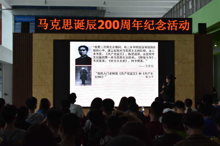 活动中,讲解人员分别从马克思主义诞生的历史条件,《共产党宣言》的内容、发表的意义等多个方面进行讲解,使学生进一步了解马克思的革命实践、理论贡献和精神境界。随后,在纪念马克思诞辰200周年讲座上,主讲人从《共产党宣言》的问世、马克思主义的理论来源、马克思主义思想的主要组成部分等方面详细阐述了马克思主义的发展历史。最后,400余名校级学生干部在学术报告厅共同观看了电影《青年马克思》,从电影中了解了马克思与恩格斯相识相知到两人受托起草“正义者同盟”规章,改组建立共产主义者同盟,合作撰写《共产党宣言》的伟大历程。