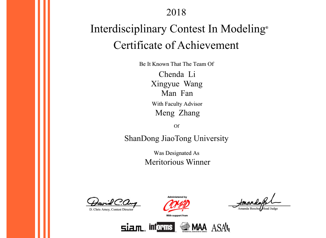 近日,在2018年美国大学生数学建模竞赛与交叉学科数学建模竞赛(MCM/ICM)中,我校交通与物流工程学院15级学生李忱达、范满、王星月组成的参赛队伍荣获美赛一等奖。