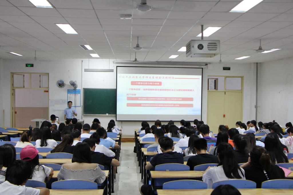马克思主义学院曹云升教授在无影山校区图书馆报告厅为在校学生作题为《让青春为实现中国梦而绽放》报告,他从梦想的含义和作用,个人梦和中国梦的关系,以青春梦托起中国梦等方面做了生动精彩的阐述讲解,激发当代大学生树立起努力实现“中国梦”的昂扬斗志。随后,曹云升又为无影山校区教职工作题为《学习习近平新时代中国特色社会主义思想》的专题报告,他认为高校教职工要持续不断加强自身理论学习,成为习近平总书记重要讲话精神的研究者、实践者,不断提高工作本领,创新方式方法,增强课堂吸引力和影响力,推动习近平总书记重要讲话精神宣讲工作往实里走、往深里走、往心里走,使广大师生学有所得、学有所悟。外国语学院分团委书记隋翀在长清校区2D103为在校学生作题为《“四个自信”,向新而行》的讲座,本次讲座分为“学习习近平总书记在北京大学师生座谈会上的讲话”、“提升‘四个自信’的基本目标”和“坚定‘四个自信’,做新时代有志青年”三个部分。隋翀希望同学们都能够成为新时代有坚定信念、能坚守并追求正确价值观的优秀青年。