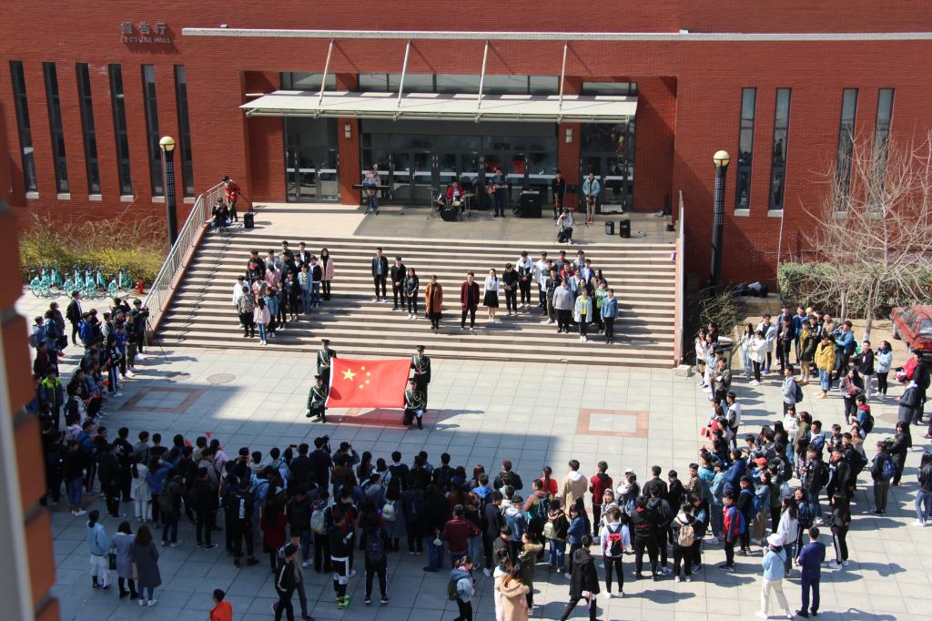3月11日,由学校团委发起,青年志愿者联合会、大学生艺术团共同组织开展的“时代青年颂·引领爱国情”——同唱《我和我的祖国》快闪活动在长清校区举行。400余名学生面向国旗,昂首挺胸,在领唱的带领下,共唱《我和我的祖国》。