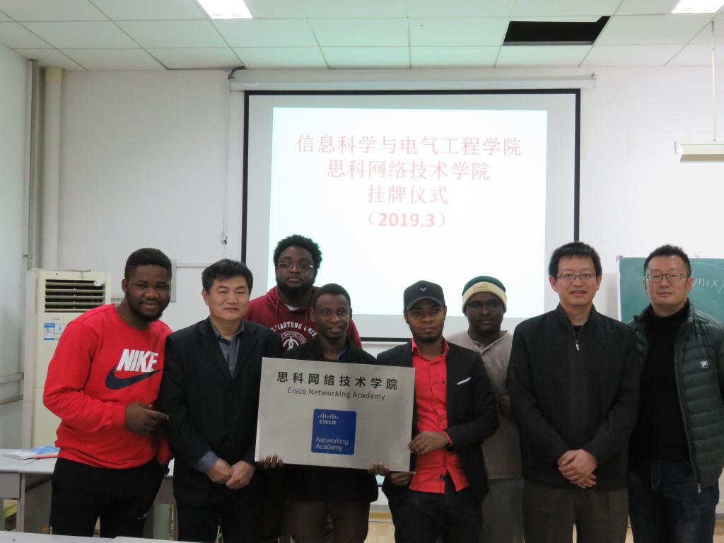 3月18日,信息科学与电气工程学院思科网络实验室正式挂牌美国思科网络技术学院(Cisco Networking Academy),学院分党委书记魏丙刚、院长张广渊、国际合作部主任张圣及学院部分留学生参加挂牌仪式。