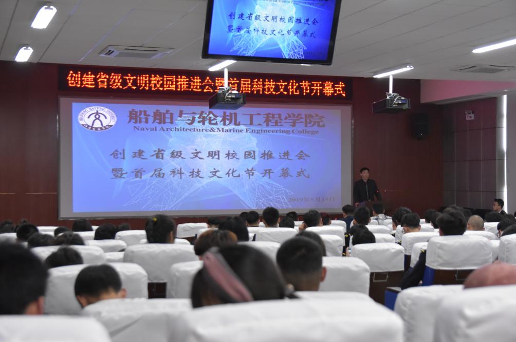 为落实学校关于省级文明校园工作部署,进一步提升校园文化建设,5月15日,船舶与轮机工程学院举行创建省级文明校园推进会暨首届科技文化节开幕式。船舶与轮机工程学院分党委副书记庄伟、全体辅导员、主要学生干部共200余人参加活动。