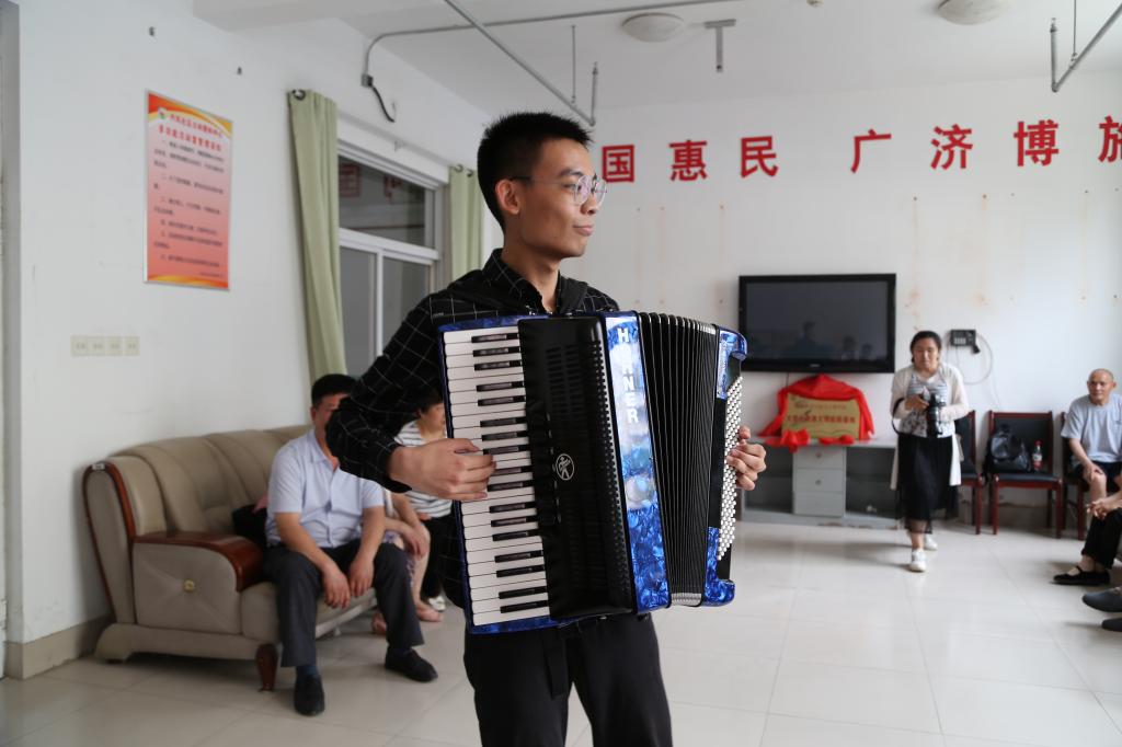 仪式结束后,党员先锋服务队在崮云湖养老院开展了“党员先锋志愿行 尊老敬老献真情”志愿服务活动,为老人带去了粽子、水果等慰问品,与老人们拉起了家常。同学们演出了精心准备的节目,手风琴独奏、快板书、小合唱等精彩的表演让在场的老人欢乐开怀。崮云湖养老院院长王传吉说:“感谢山东交通学院的同学们,让老人们提前度过了一个热闹祥和的端午节。”