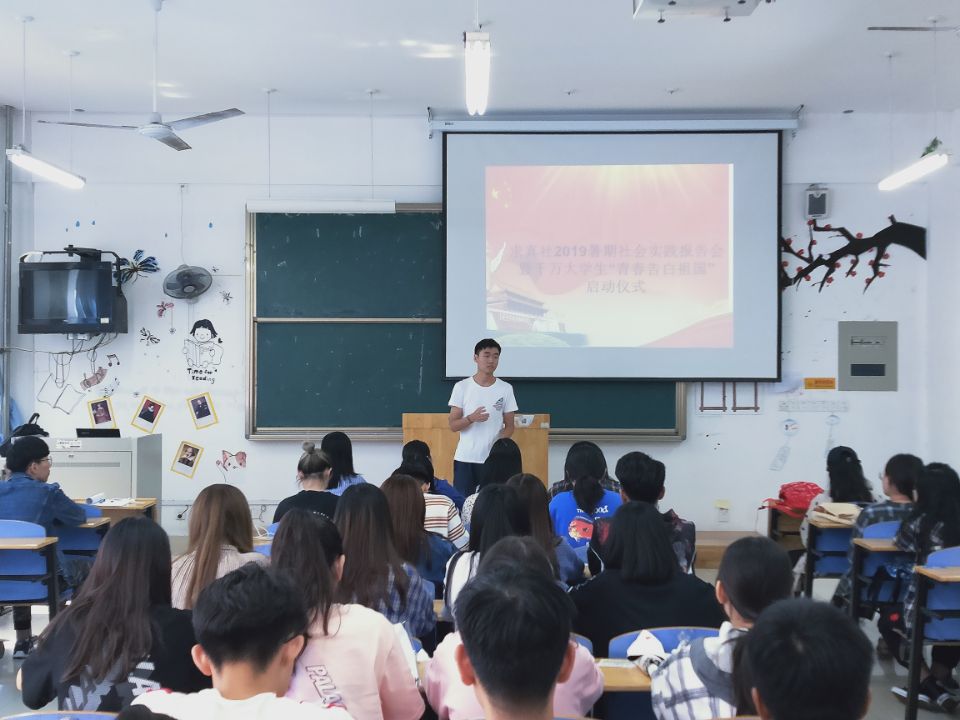 9月18日下午,外国语学院求真社在2A103教室举行2019年暑期社会实践报告会暨千万大学生“青春告白祖国”启动活动。学院分党委副书记朱鸿义、辅导员老师及50余名求真社成员参加活动。