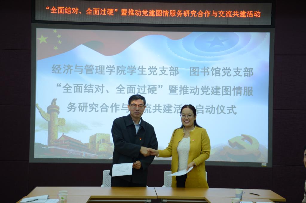 10月11日上午,经济与管理学院学生党支部与图书馆党支部“全面结对、全面过硬”暨推动党建图情服务研究合作与交流共建活动在1号教学楼b座104室举行,经济与管理学院分党委常务副书记王洪鹏、图书馆馆长刘一石、副馆长高友宾及全体学生党支部书记出席会议。会议由分党委常务副书记王洪鹏主持。