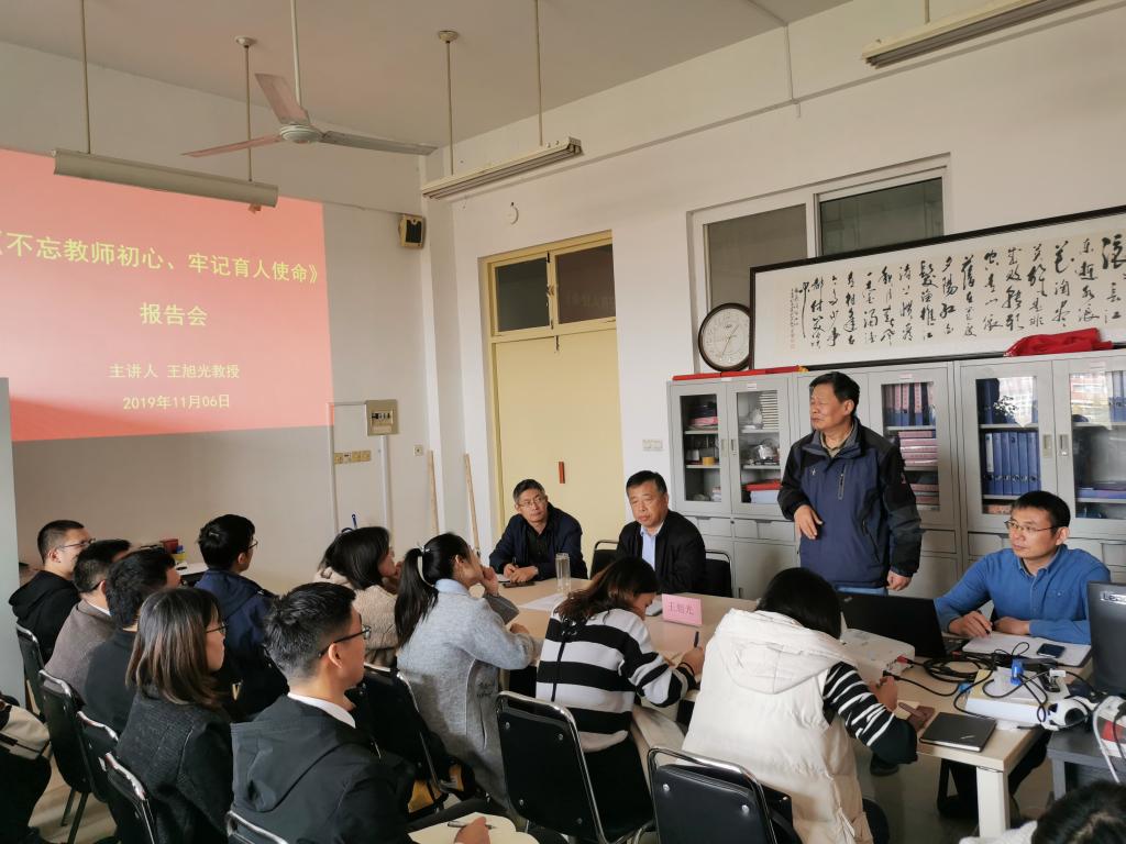 11月6日下午,轨道交通学院在1A410举办“不忘教师初心、牢记育人使命”报告会,邀请山东省优秀教师、我校师德标兵王旭光教授作报告。会议由党总支书记宿林林主持。