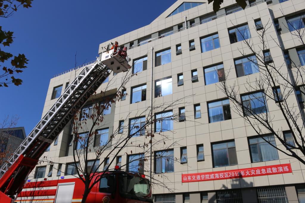 在威海校区,警报组成员在宿舍楼内点燃发烟饼,联动警报响起,消防广播发出疏散警示。楼内人员根据消防广播指引,弯腰低姿,迅速撤离火灾现场。过程中,现场疏导组发现A412宿舍内有两名学生被困,紧急使用119电话报警。驻地马山消防中队接警迅速派出3辆消防车赶往火灾现场,使用消防云梯将被困人员解救到地面。全体师生观摩了消防战士模拟灭火的实战演练。
