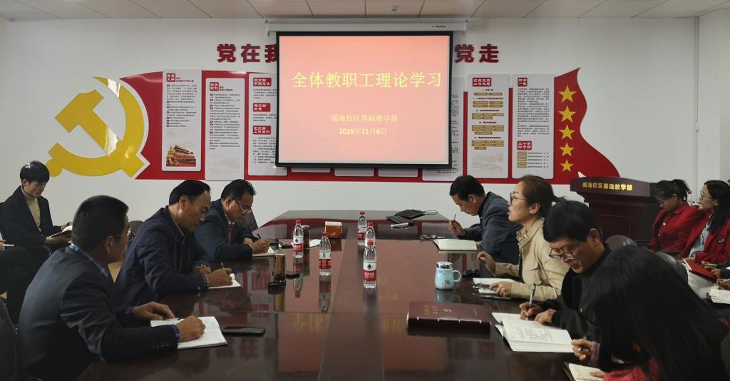 威海校区基础教学部党总支通过理论学习中心组、党员集中专题学习、教职工理论学习等层面展开全面学习贯彻。党总支理论学习中心组于11月6日、11月12日、11月13日,分别开展了三次集中学习,深入学习《中国共产党第十九届中央委员会第四次全体会议公报》《决定》及其说明等重要文件精神。
