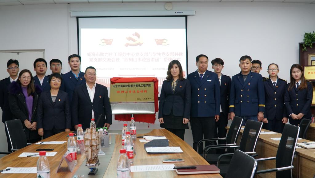 11月13日,船舶与轮机工程学院分党委与威海市助力社工服务中心党支部在学院党员活动室开展共建党支部交流会暨“殷树山事迹宣讲团”授牌仪式。