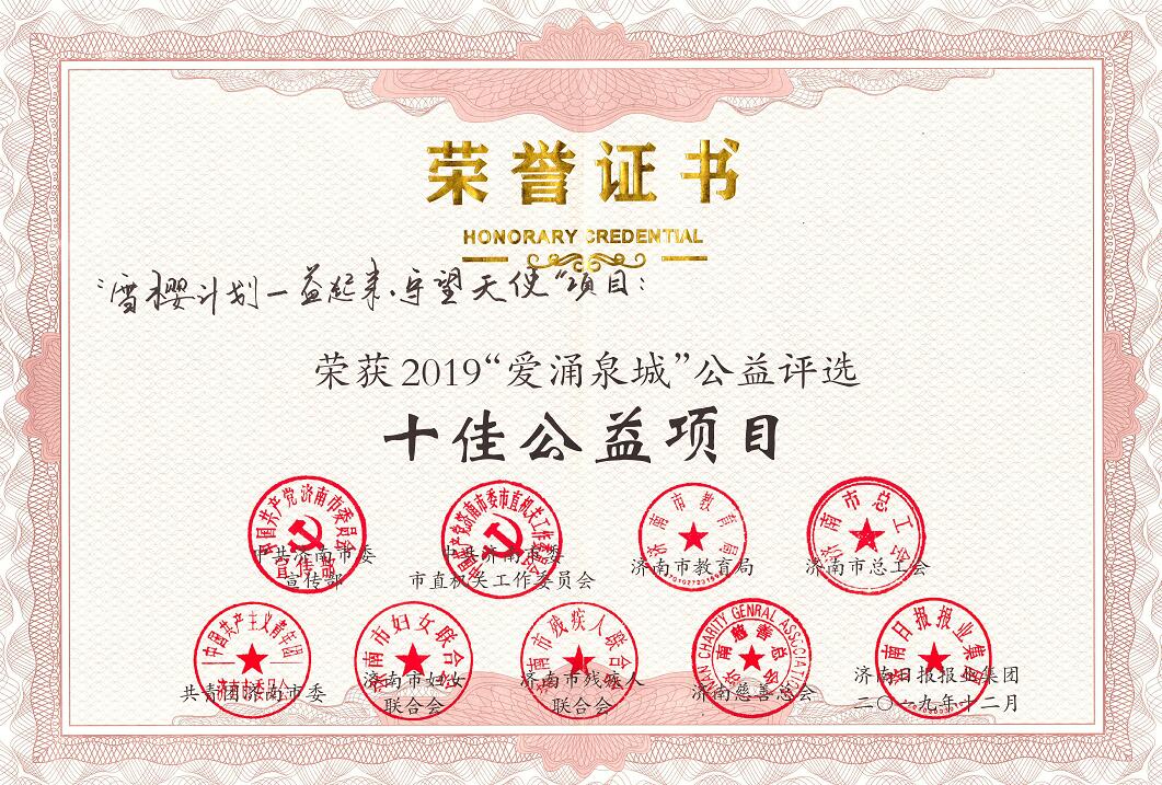 2019“爱涌泉城”公益评选活动颁奖典礼于12月24日在省会大剧院举行。我校泉城义工新时代文明实践志愿服务队申报的“益起来•守望天使”志愿服务项目荣获本次公益评选活动十佳公益项目。