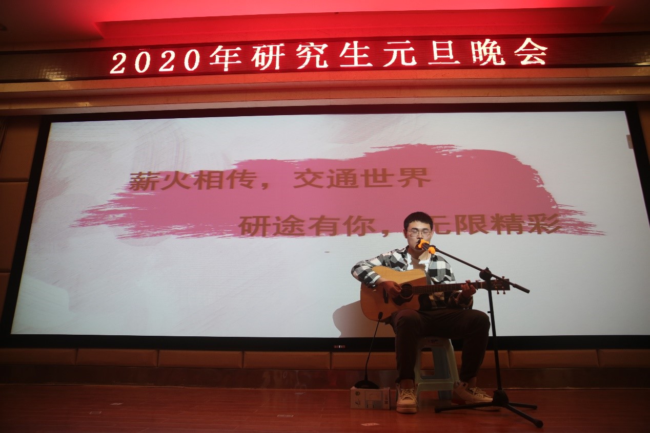 随着助演社团甜心轰炸机的助兴爵士开场表演,现场氛围迅速升温。吉他弹唱优雅演绎《突然好想你》,缓缓打开青涩篇章。小品《赌神》幽默诙谐,引得现场观众笑声不断,同时警醒广大研究生要遵纪守法,奋发图强。歌曲串烧内容脍炙人口,节目意境如诗如画。节目间隙穿插了游戏互动环节,调动了同学们的积极性。晚会在师生们对新一年的展望和祝福声中圆满结束。