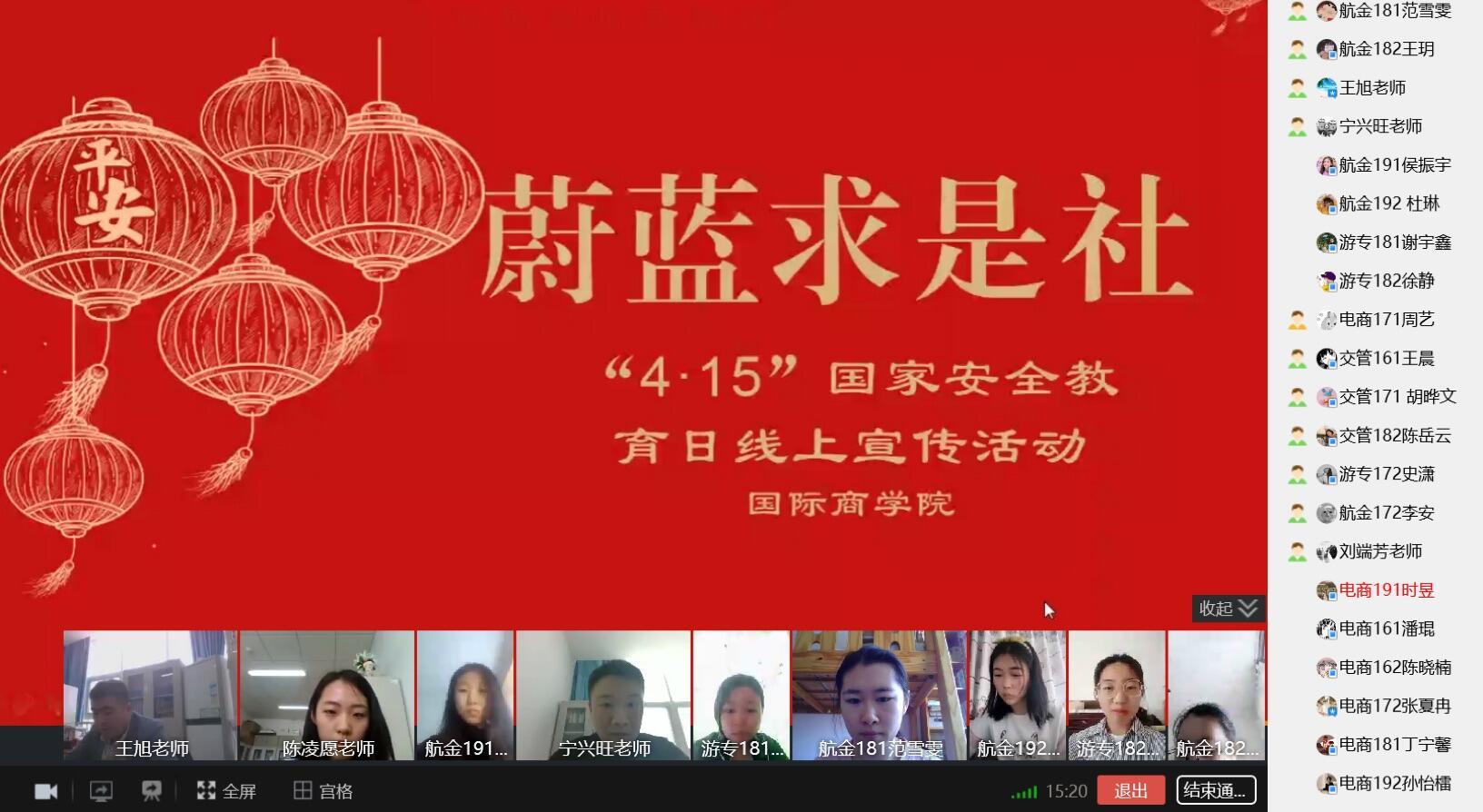 4月15日是第5个全民国家安全教育日,国际商学院蔚蓝求是社开展了国家安全教育日线上宣传活动,活动由学院团总支书记主持,辅导员及蔚蓝求是社全体社员参加。