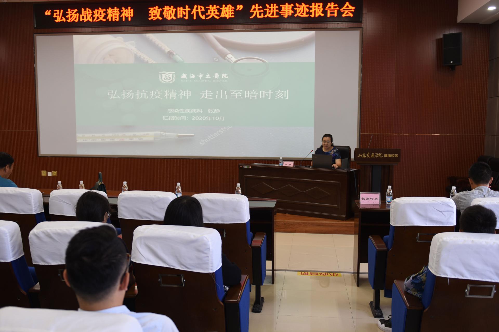 报告会上,张静以“弘扬伟大抗疫精神,走出至暗时刻”为题,从“至暗时刻——我的抗疫故事”“荣耀时刻——走进人民大会堂”“弘扬伟大抗疫精神再创伟业”和“防疫小知识”四个方面,分享了在抗击新冠肺炎的过程中,作为威海市救治组组长,辗转威海市胸科医院和烟台奇山医院参与救治工作,圆满完成救治任务的感人事迹。