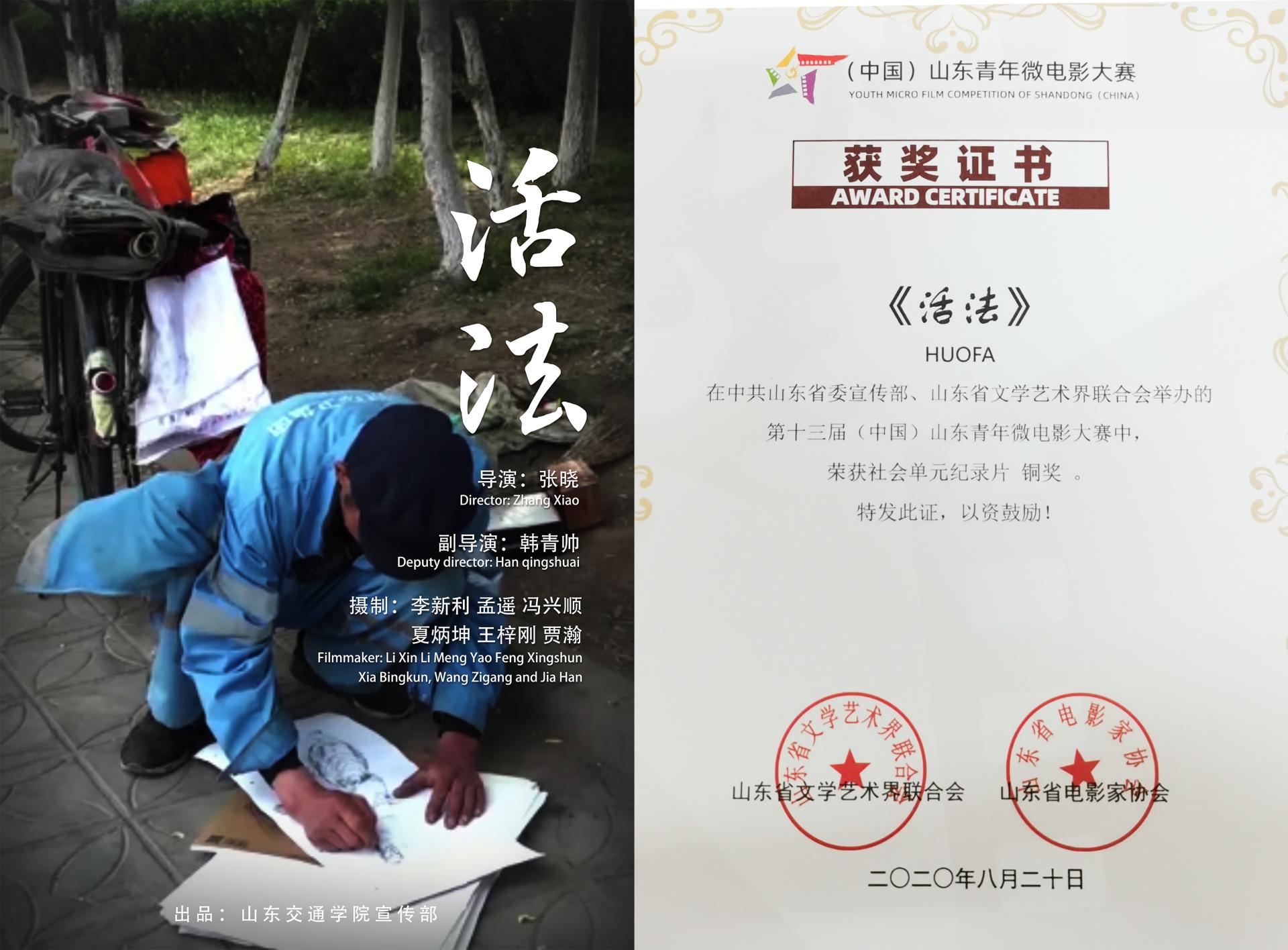 近日,第十三届(中国)山东青年微电影大赛评选结果揭晓,我校党委宣传部原创纪录片《活法》获得社会单元纪录片铜奖。