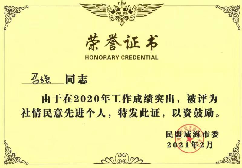 近日,民盟威海市委发布2020年度工作总结表彰文件,表彰在发挥界别优势、深入调研并积极建言献策方面做出贡献的先进集体和先进个人。我校教授、民盟威海市高等教育支部主委马强获得“社情民意先进个人”荣誉称号。