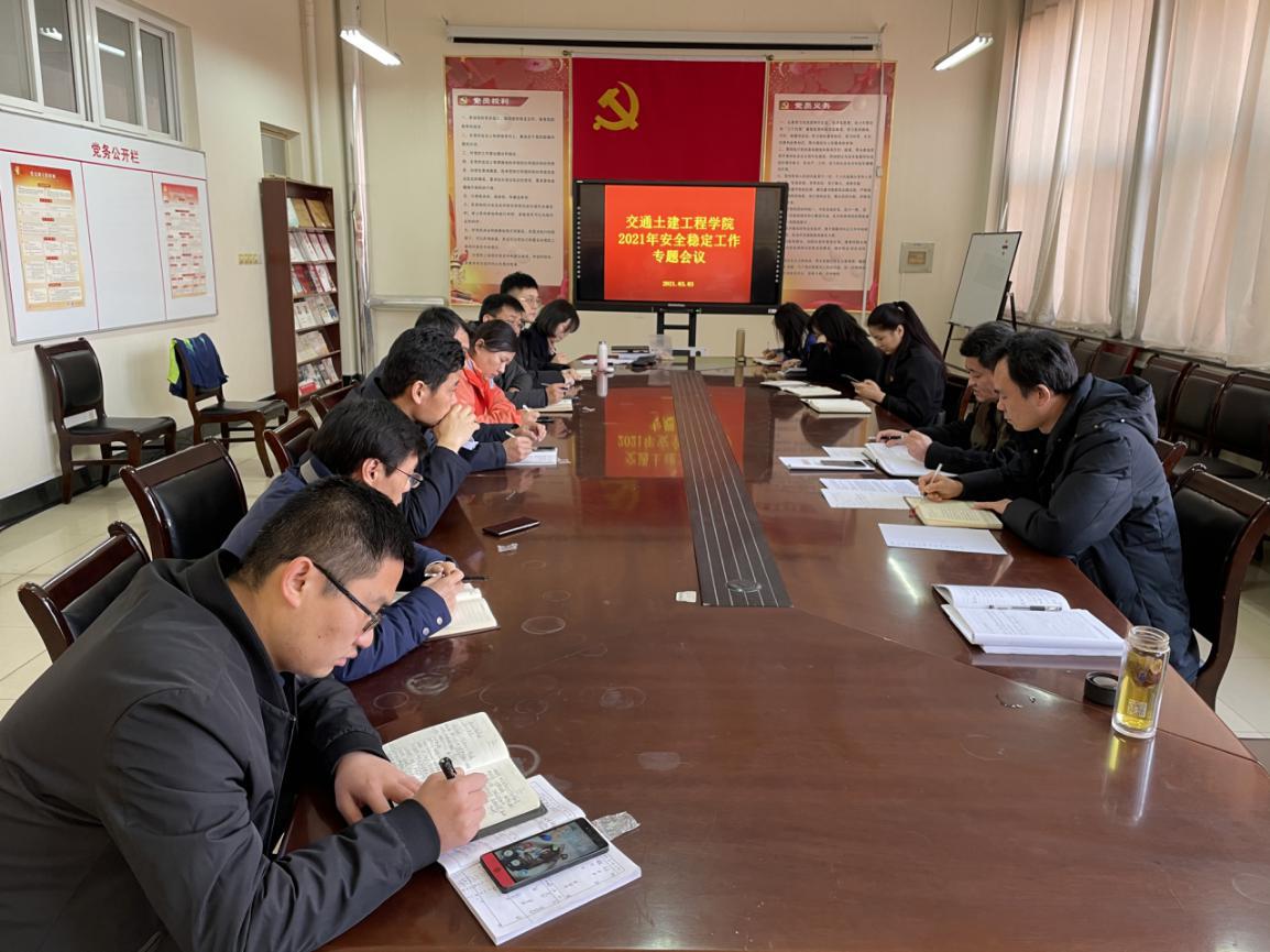 3月3日上午,交通土建工程学院在B308会议室召开2021年安全稳定工作专题会议,学院分党委成员、各党支部书记参加会议,会议由分党委书记李西田主持。