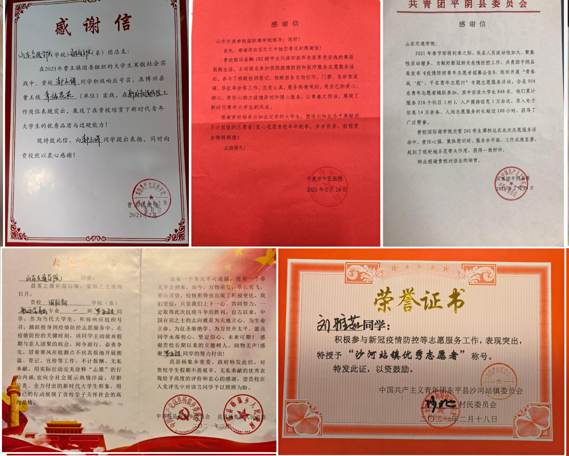 近日,国际商学院收到来自中共范县杨集乡委、共青团平阴县委、共青团东平县沙河站镇委等单位以及各地社区寄来的感谢信。信中对国际商学院“国商青犁”新时代文明实践志愿服务队的同学们积极主动加入疫情防控志愿服务队伍、为当地疫情防控工作的无私奉献表示感谢,对学校立德树人的成效给予了高度评价。