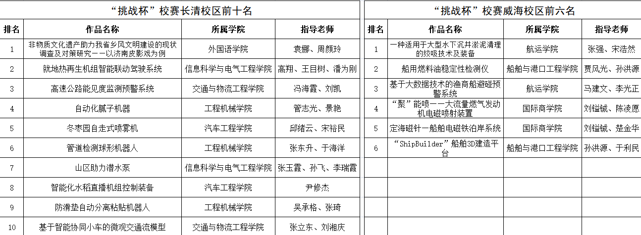 本次校内排位赛长清校区共有22件作品参赛,威海校区共有10件作品参赛,经过团队展示、专家提问等环节,《非物质文化遗产助力我省乡风文明建设的现状调查及对策研究——以济南皮影戏为例》等十项作品获得长清校区校内排位赛前十名;《一种适用于大型水下沉井淤泥清理的绞吸技术及装备》等六项作品获得威海校区的前六名。