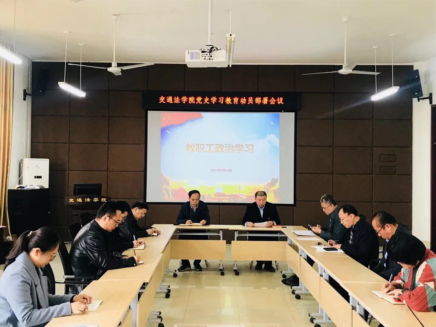 3月24日下午,交通法学院在2C406召开党史学习教育动员部署会。学院全体教师参加会议,会议由学院党总支书记闫淼主持。