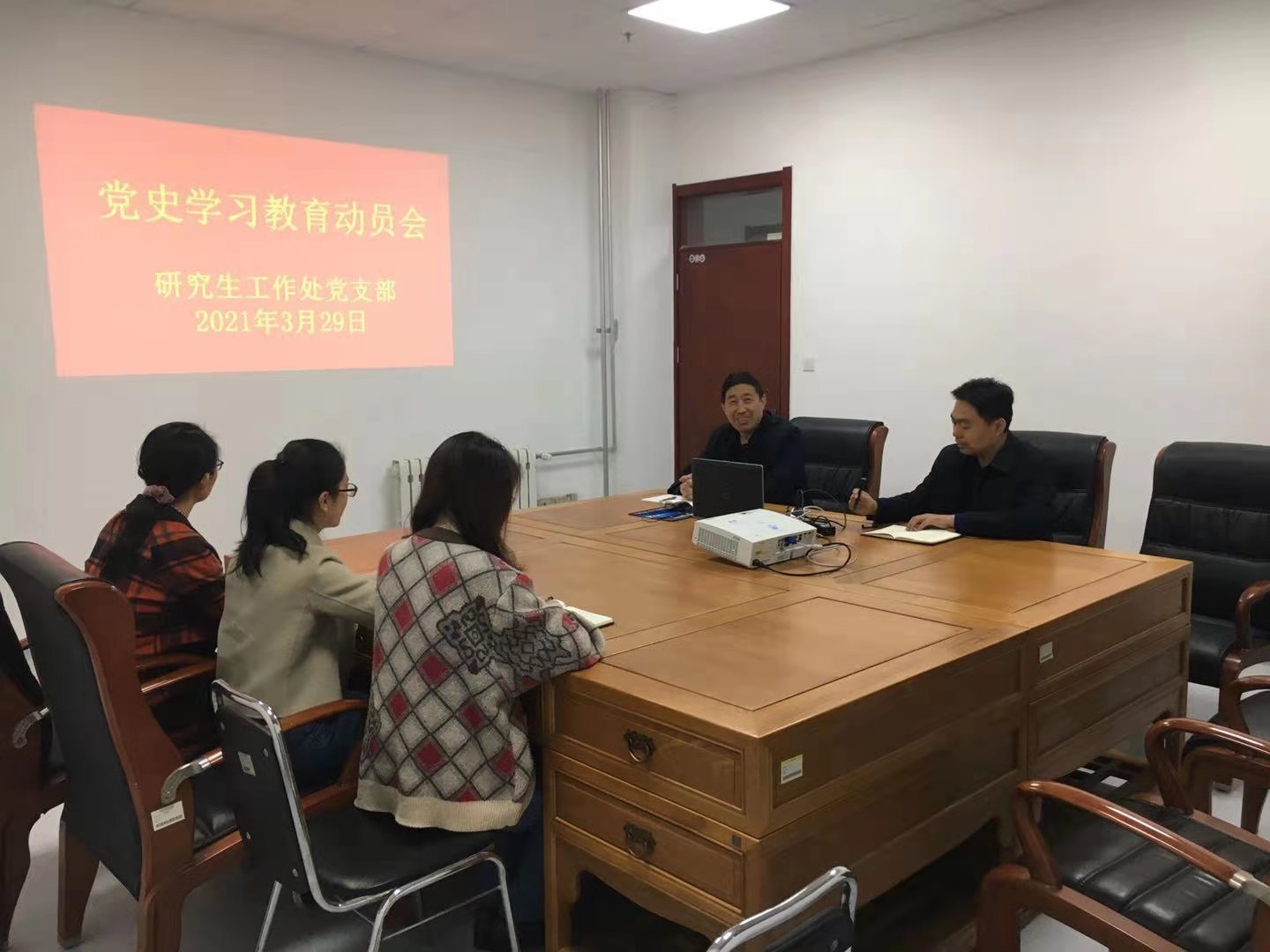 3月29日上午,研究生工作处党支部在长清校区明德楼125会议室召开党史学习教育动员会。会议由党支部书记唐新德主持。